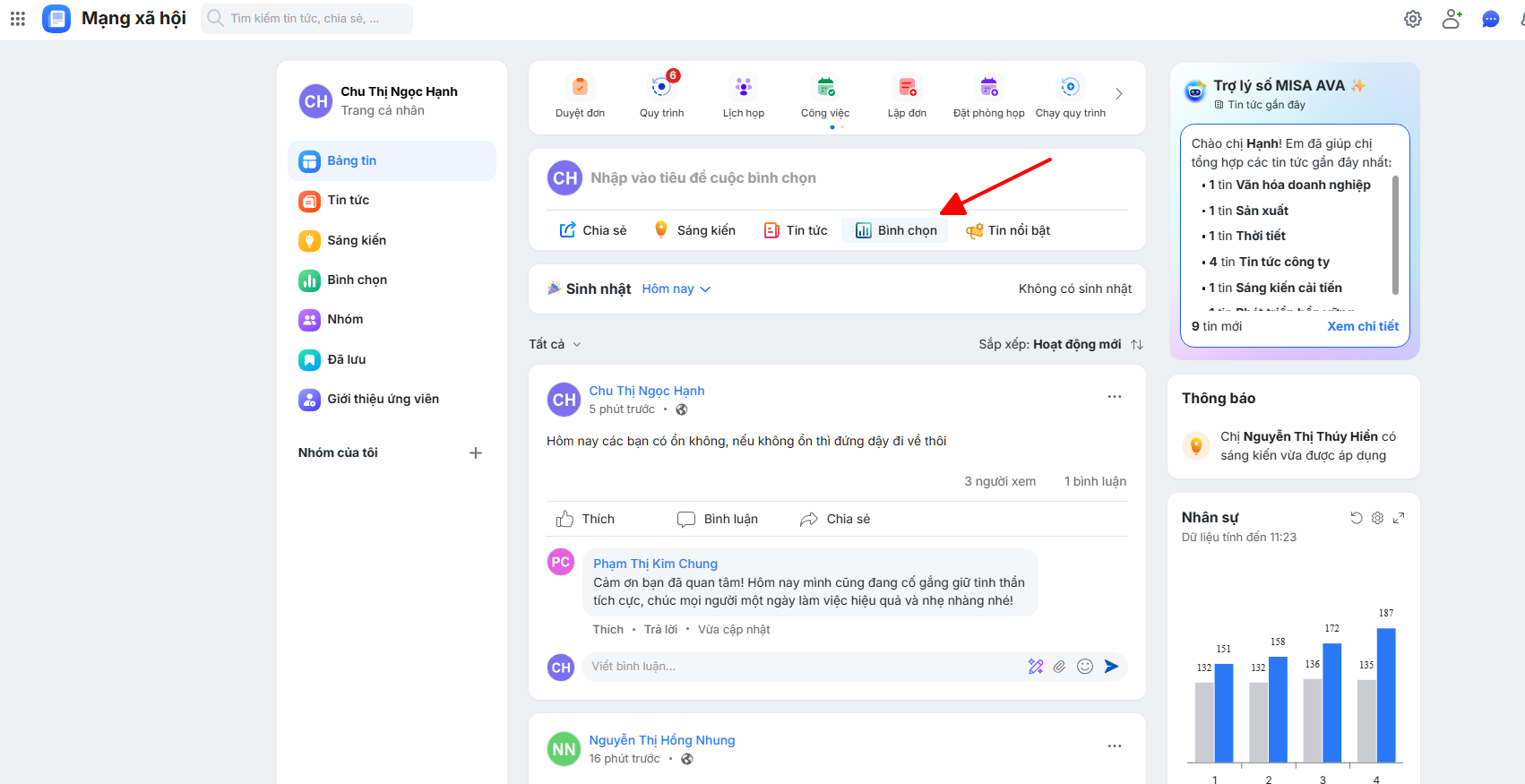 Ở giữa màn hình là các bài viết Tin tức, Chia sẻSáng kiến,… nơi tất cả các thành viên cùng tương tác, trao đổi, sẻ chia để tạo dòng chảy thông tin nội bộ trong doanh nghiệp.