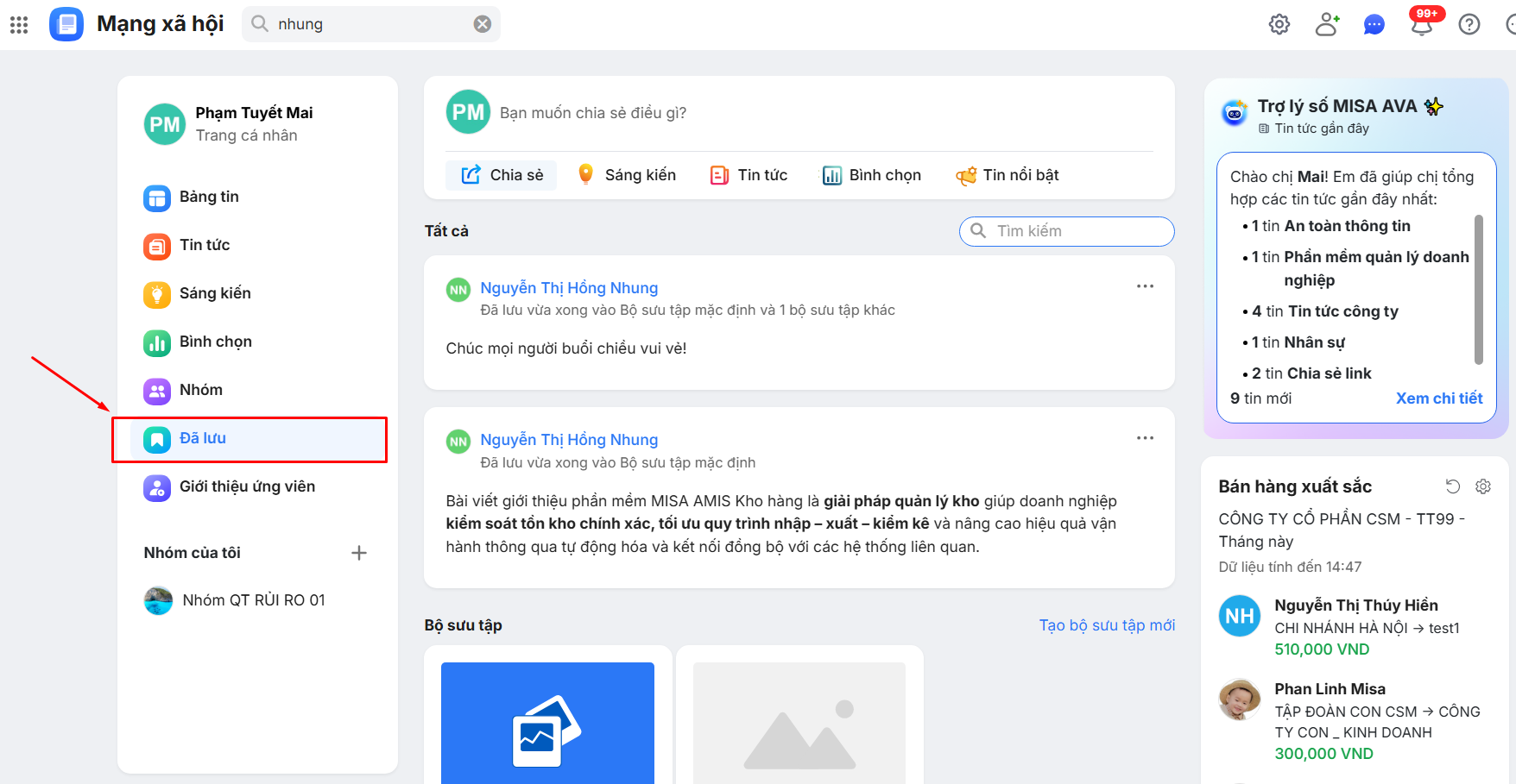 Bước 1: Trên giao diện AMIS Mạng xã hội\ Vào phân mục Đã lưu.