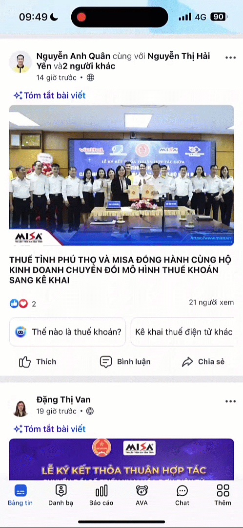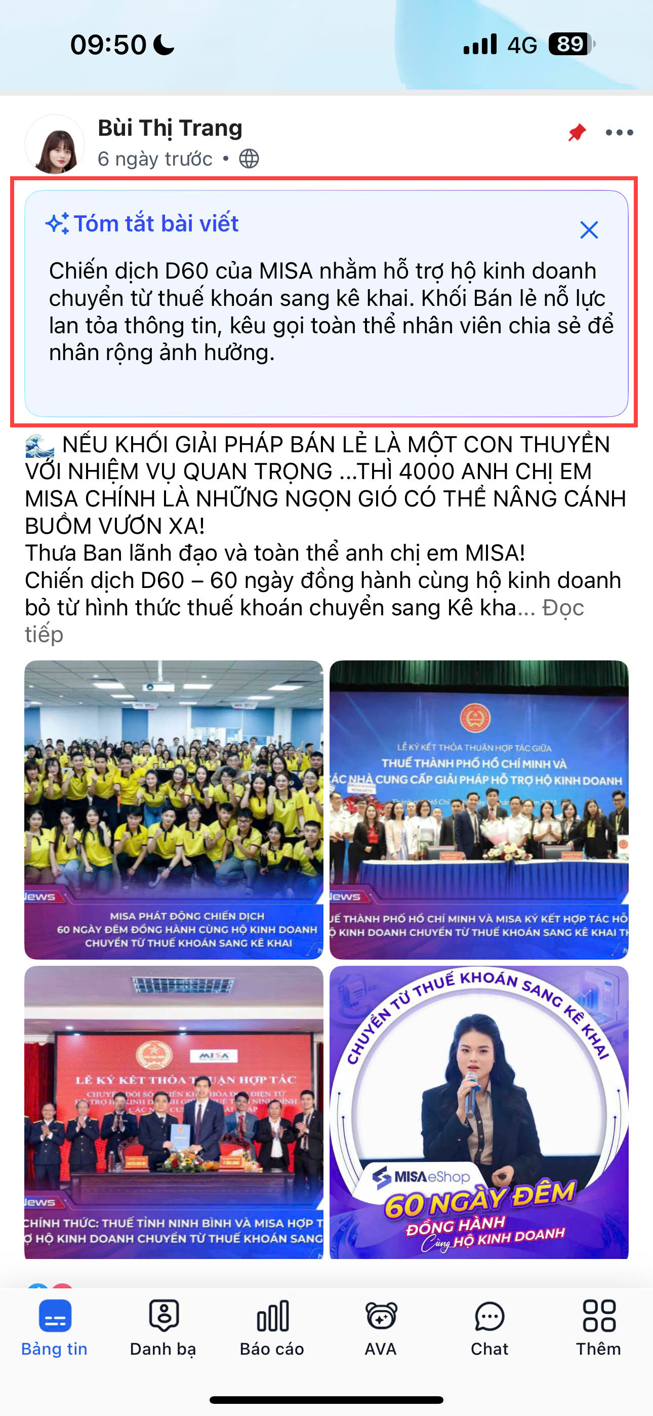 Tính năng Tóm tắt bài viết bằng AI được tích hợp trực tiếp vào mạng xã hội của AVA, giúp anh/chị nhanh chóng nắm bắt những ý chính của các bài viết dài mà không cần đọc toàn bộ nội dung. Trợ lý ảo AVA sẽ tự động phân tích và đưa ra bản tóm tắt ngắn gọn, tiết kiệm thời gian và tăng hiệu quả tiếp nhận thông tin.
