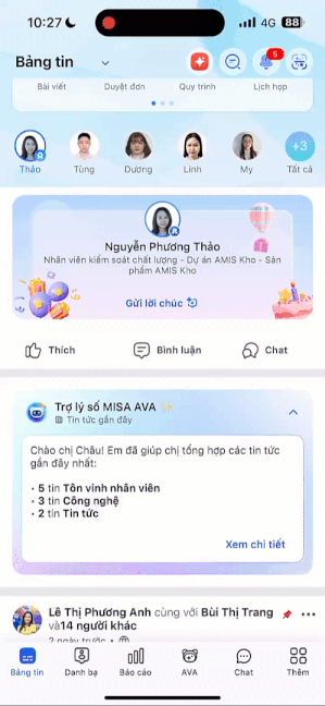 Tính năng Tổng hợp tin tức với AVA giúp anh/chị cập nhật nhanh các thông tin mới nhất trên mạng xã hội nội bộ, chọn lọc các tin truyền thông quan trọng, tiết kiệm thời gian và đảm bảo không bỏ lỡ nội dung hữu ích cho công việc. Tính năng này phù hợp cho mọi nhân viên thường xuyên theo dõi tin tức nội bộ và muốn nắm bắt thông tin nhanh chóng, chọn lọc.