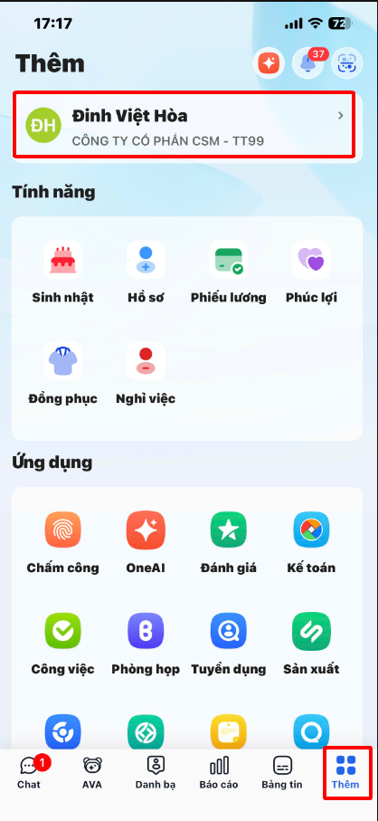 Bước 1: Trên giao diện MISA AMIS, chạm vào Thêm. Chọn vào dòng thông tin cá nhân.