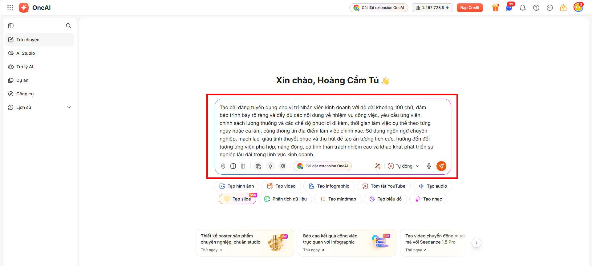 Hệ thống tự động tối ưu prompt và hiển thị ở ô nhập liệu.