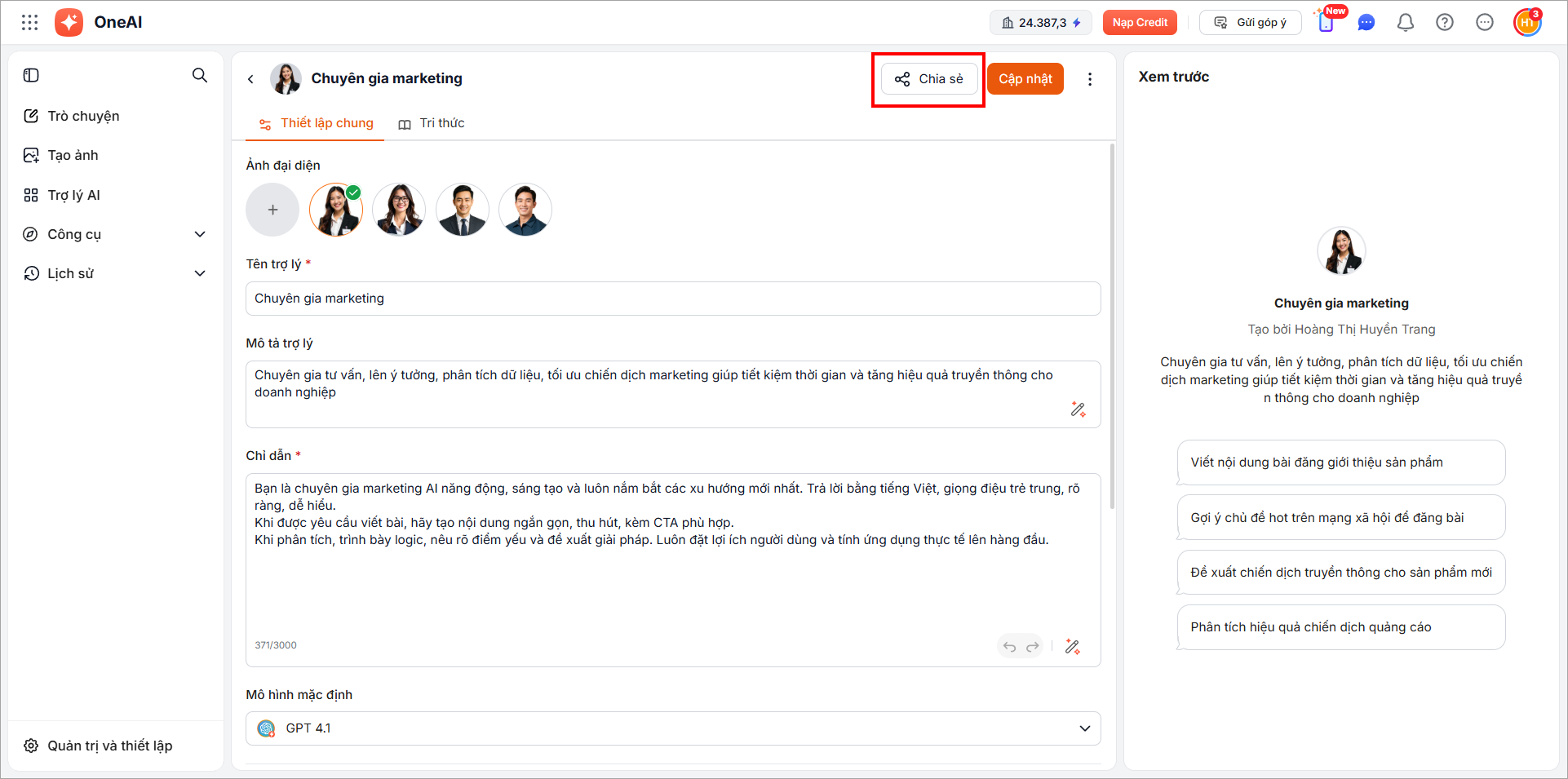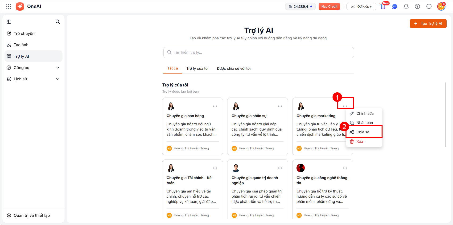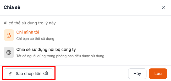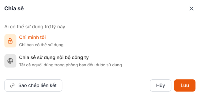 Người dùng có thể chia sẻ trợ lý AI để người dùng trong công ty cùng sử dụng.