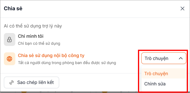 Chọn quyền sử dụng là Trò chuyện (người được chia sẻ chỉ có quyền hỏi đáp với trợ lý) hoặc Chỉnh sửa (người được chia sẻ có cả quyền hỏi đáp và chỉnh sửa trợ lý).