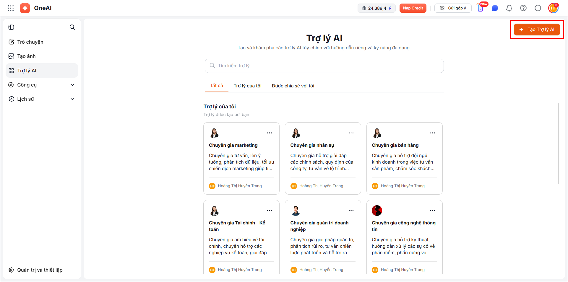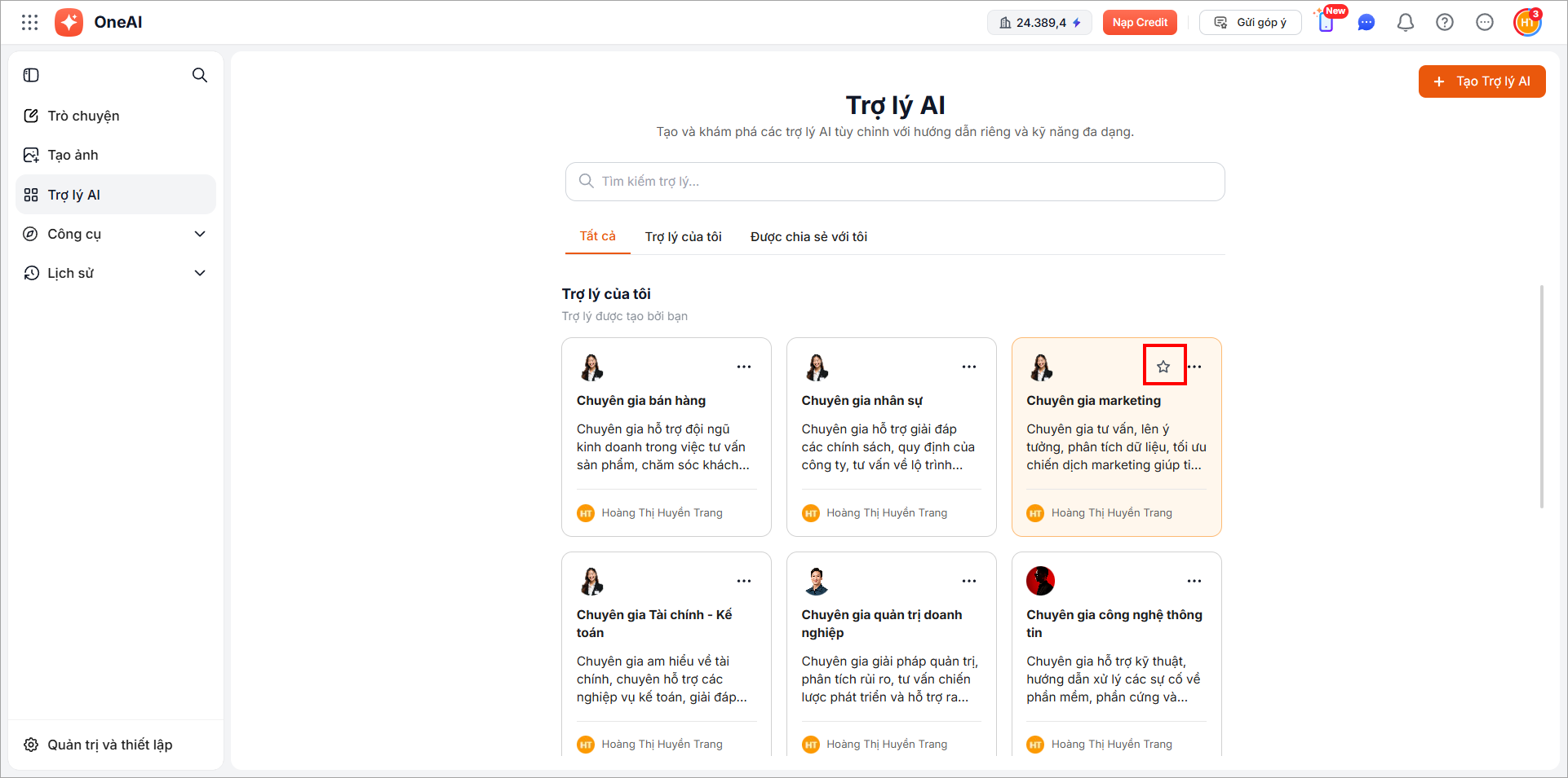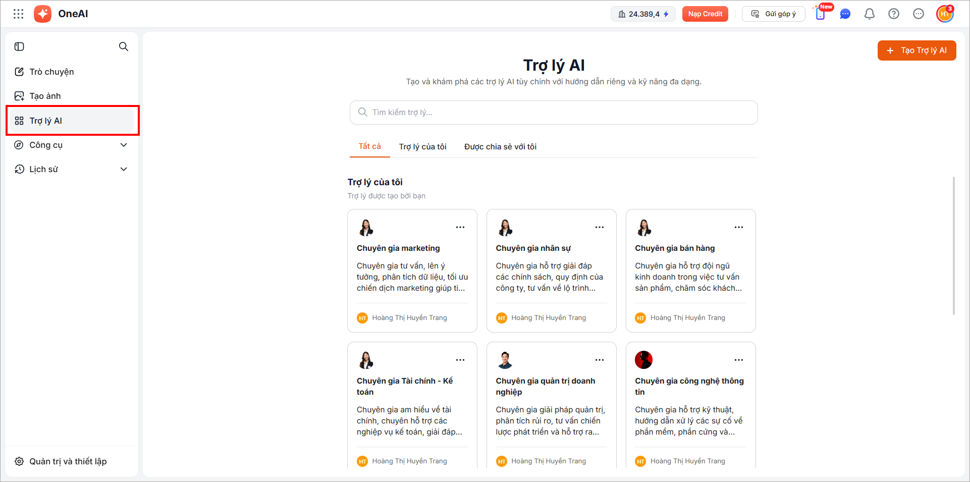 Giao diện Trợ lý AI hiển thị danh sách trợ lý được phân loại theo các nhóm: