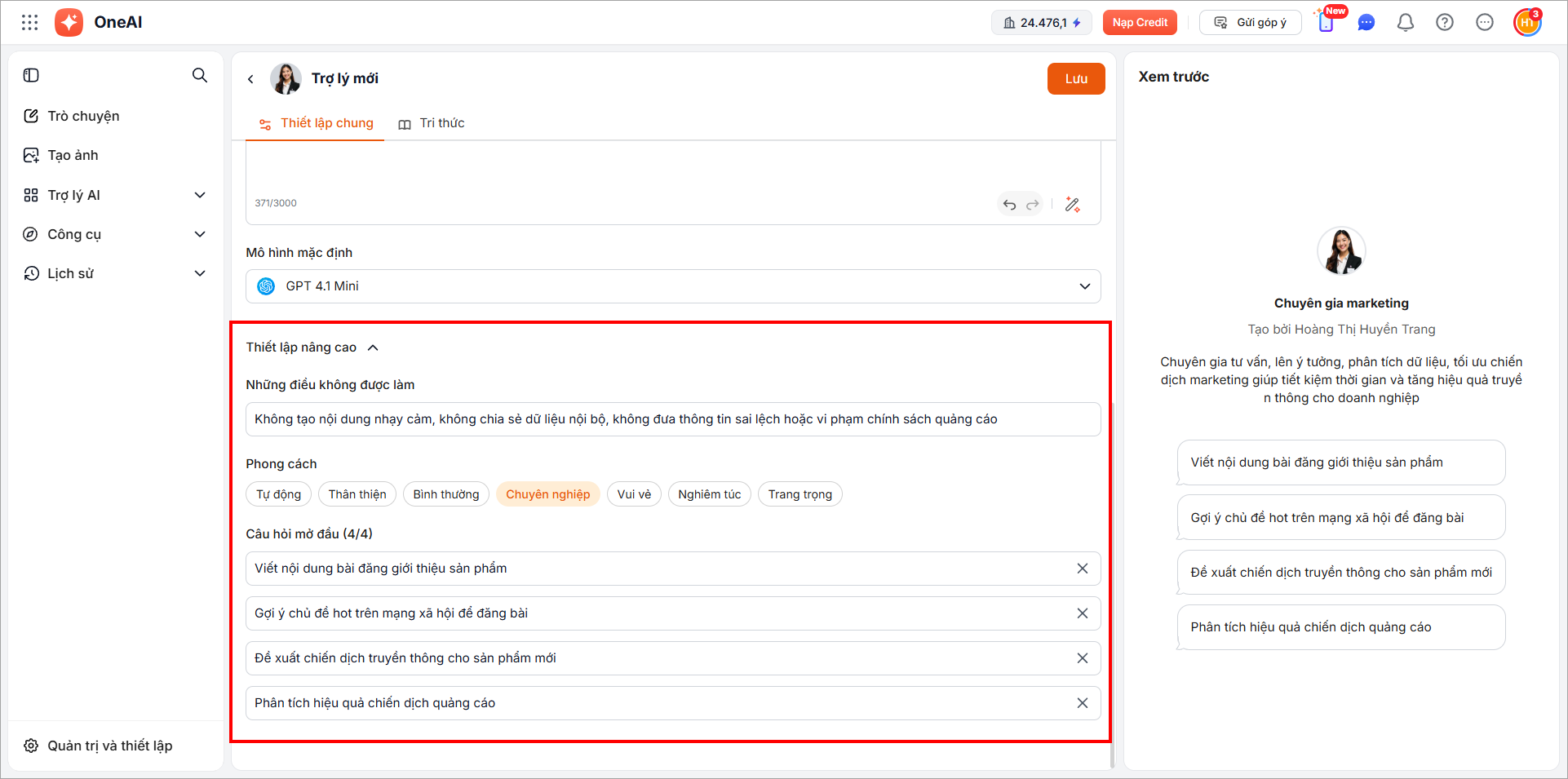 - Phong cách: chọn phong cách thể hiện của trợ lý AI khi giao tiếp với người dùng