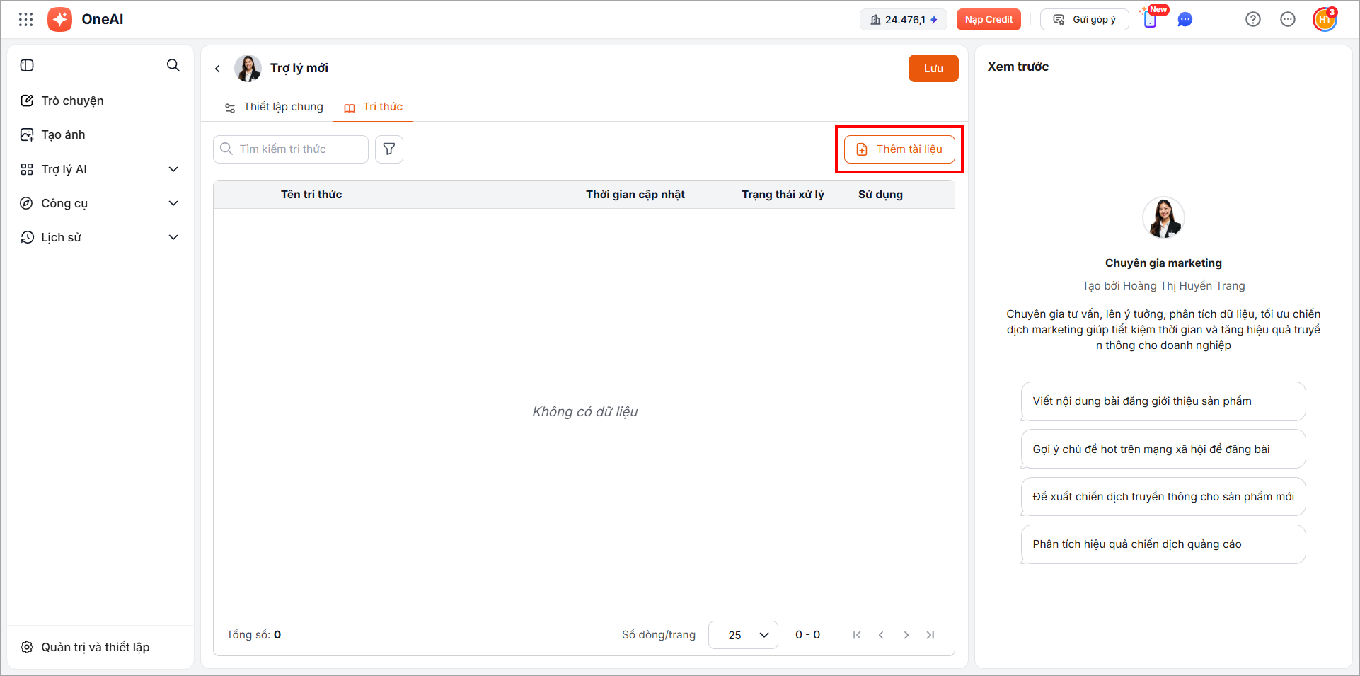 – Mỗi Trợ lý AI có thể lưu tối đa 500MB cho cả 3 loại tri thức.