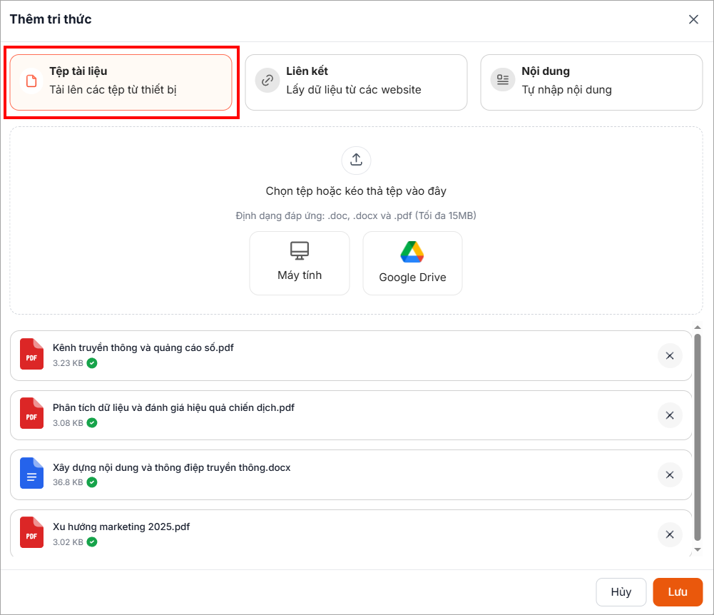 Tải lên tệp từ thiết bị (định dạng: .doc, .docx, .pdf, dung lượng tối đa 15MB/tệp).