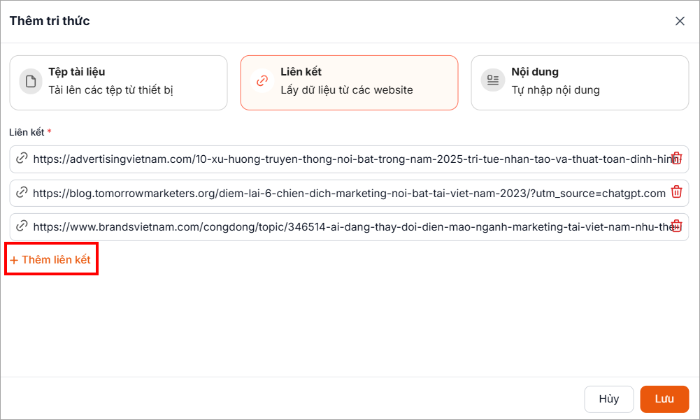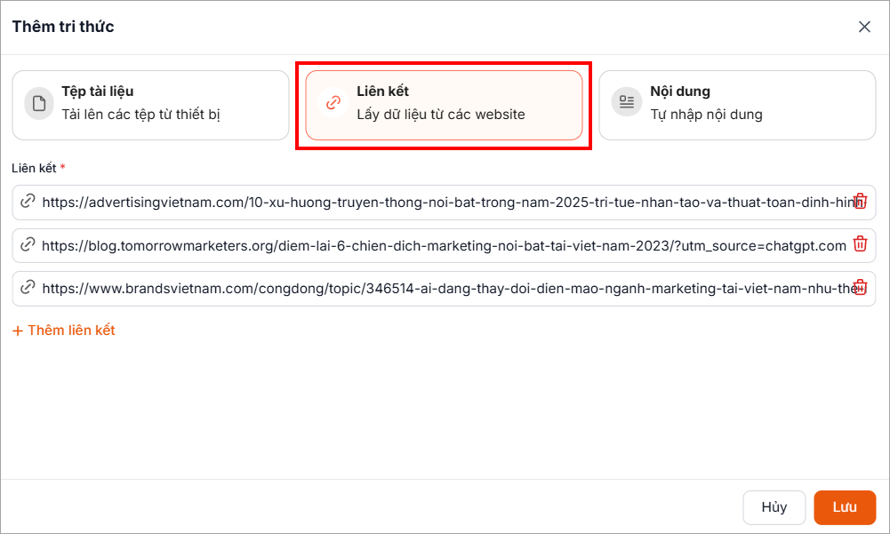 Nhập đường dẫn (link) chứa nội dung tri thức vào ô nhập liệu.