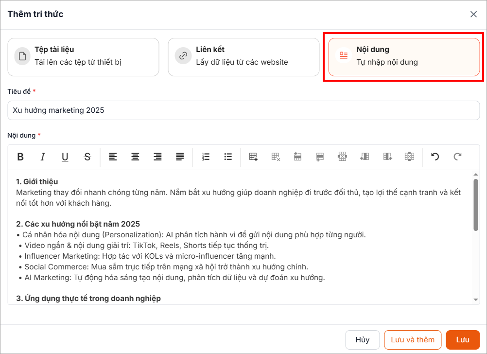 Nhập Tiêu đề và Nội dung tri thức. Sau đó nhấn Lưu.