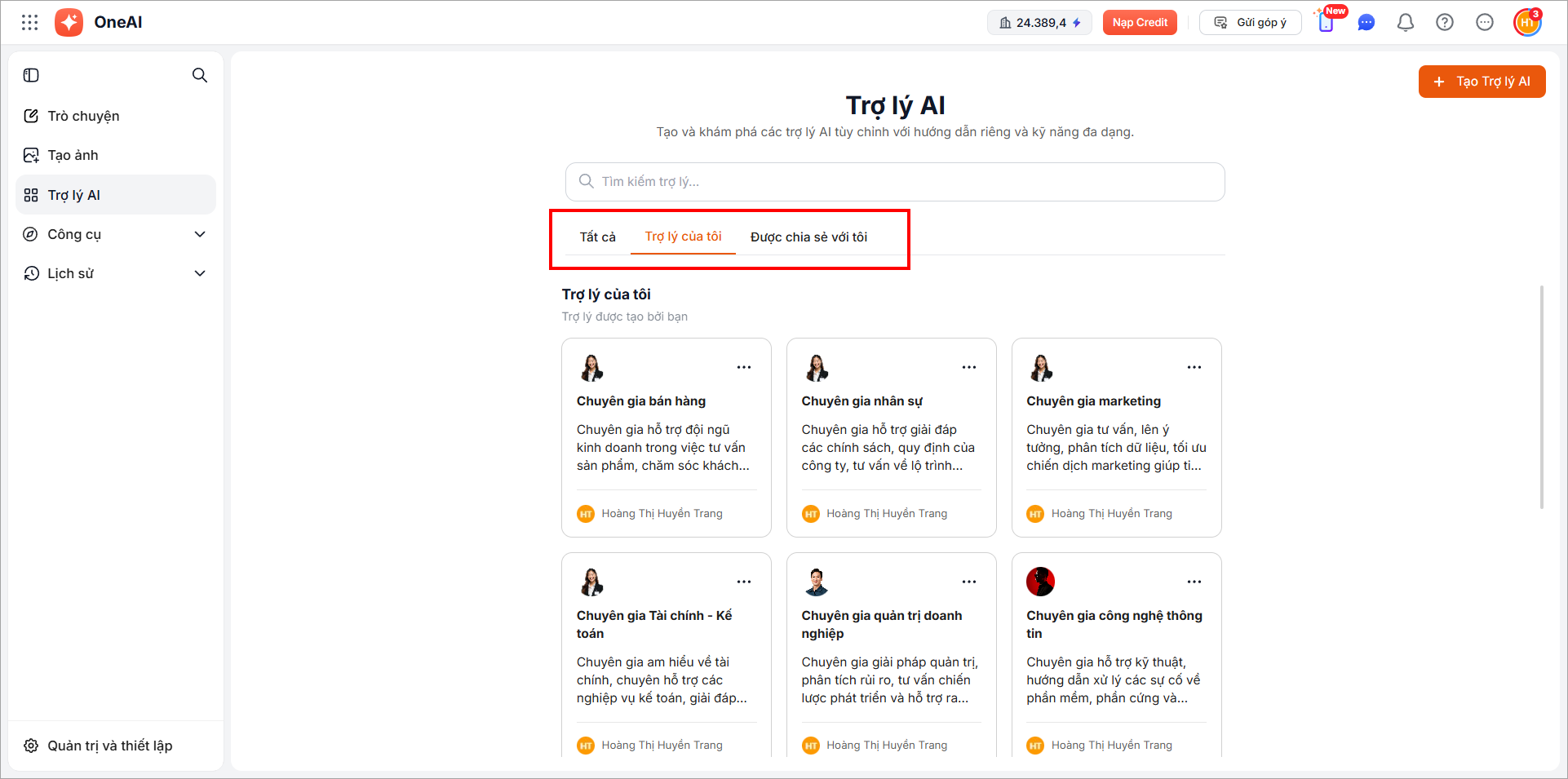- Trợ lý của tôi: trợ lý do người dùng tạo