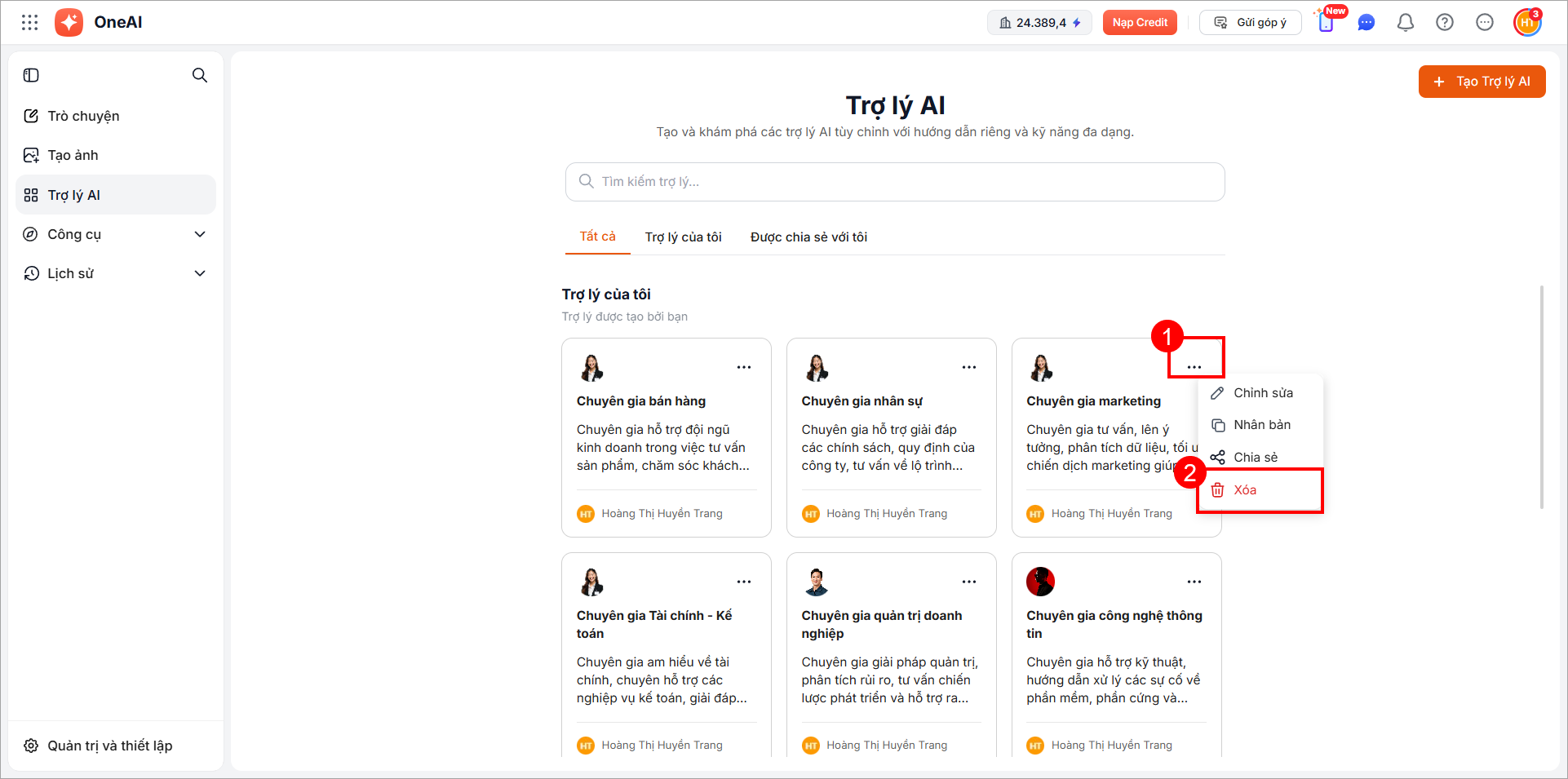 Trên danh sách trợ lý AI, di chuột vào ô trợ lý và nhấn biểu tượng. Sau đó nhấn Xóa.