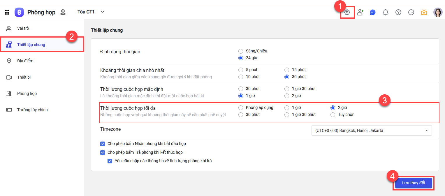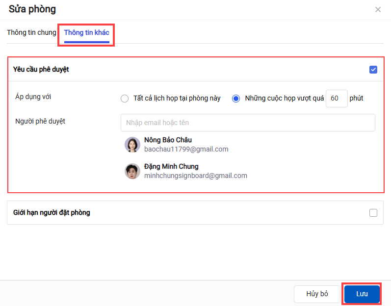 - Để kiểm tra hoặc thay đổi thông tin phê duyệt cho từng phòng, vào Thiết lập > Phòng họp và chỉnh sửa phòng họp tương ứng.