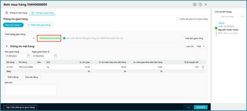 Sau khi thiết lập trên AMIS Workflow, phần mềm sẽ tự động đồng bộ thông tin Đợt giao hàng như đã thiết lập.