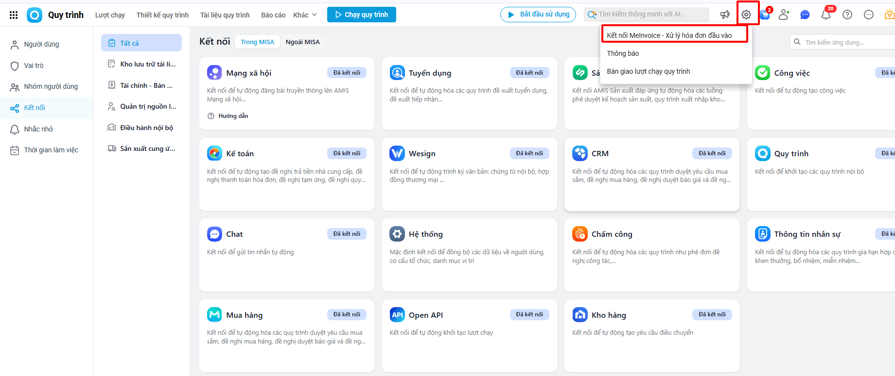 Bước 1: Đăng nhập vào phần mềm AMIS Quy trình, chọn Biểu tượng bánh răng (Cài đặt)\Kết nối Meinvoice – Xử lý hóa đơn đầu vào