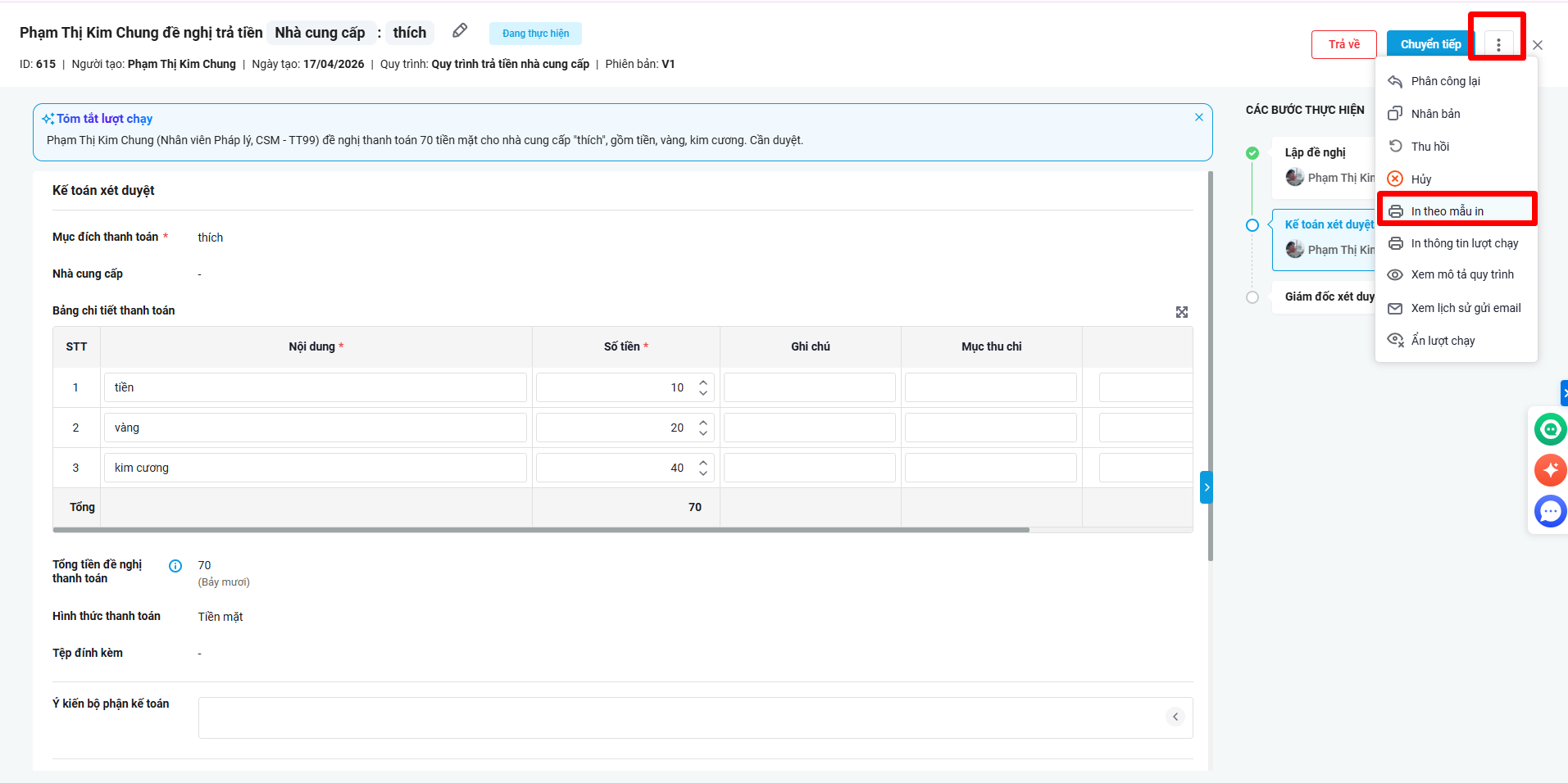 Bước 1. Trên giao diện chi tiết lượt chạy, chọn biểu tượng , nhấn In theo mẫu in.