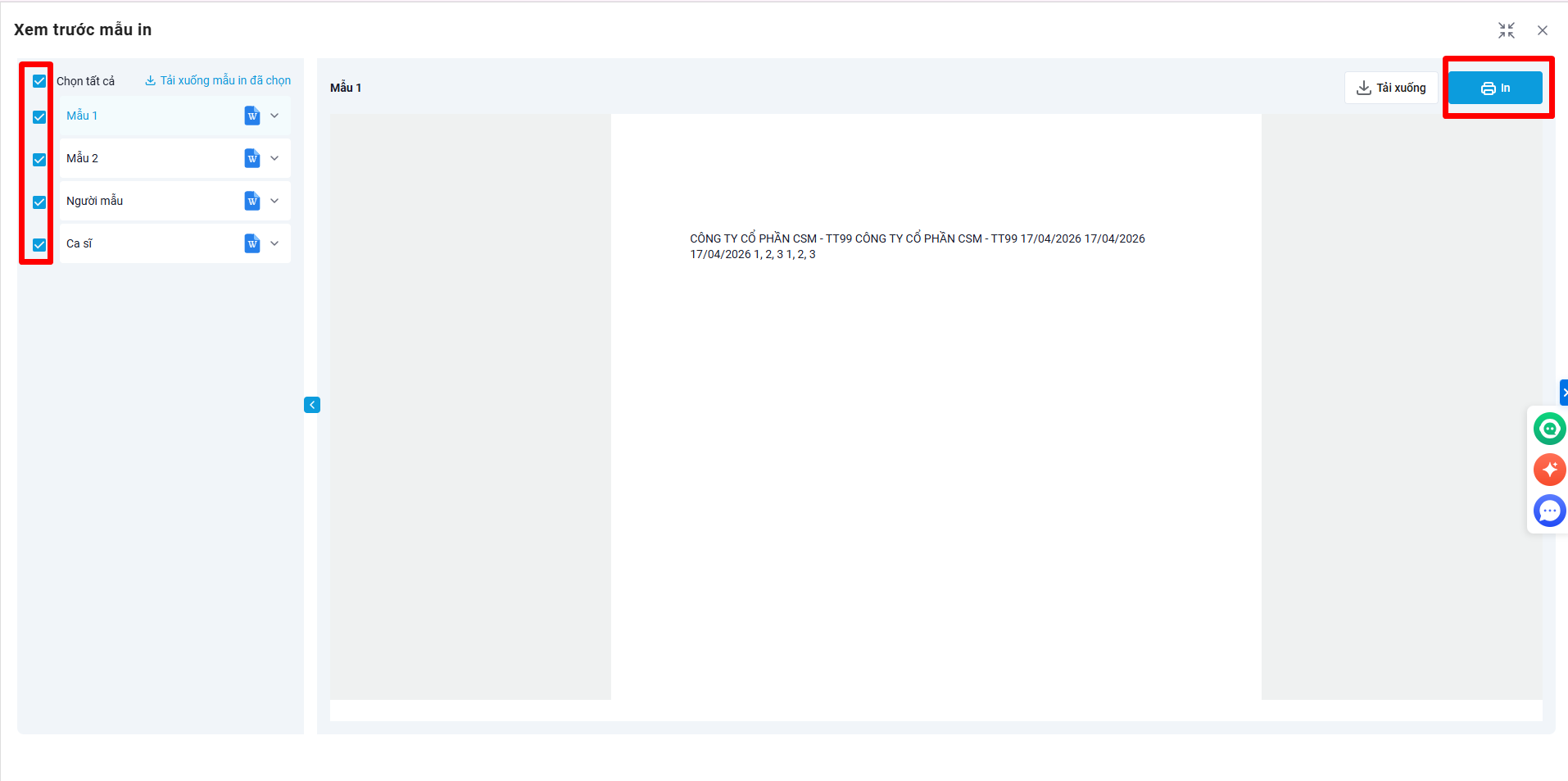 Bước 2. Chương trình sẽ hiển thị danh sách các mẫu in lượt chạy, tích chọn các mẫu muốn in hoặc tất cả các mẫu in, sau đó nhấn Tải xuống hàng loạt nhanh chóng.