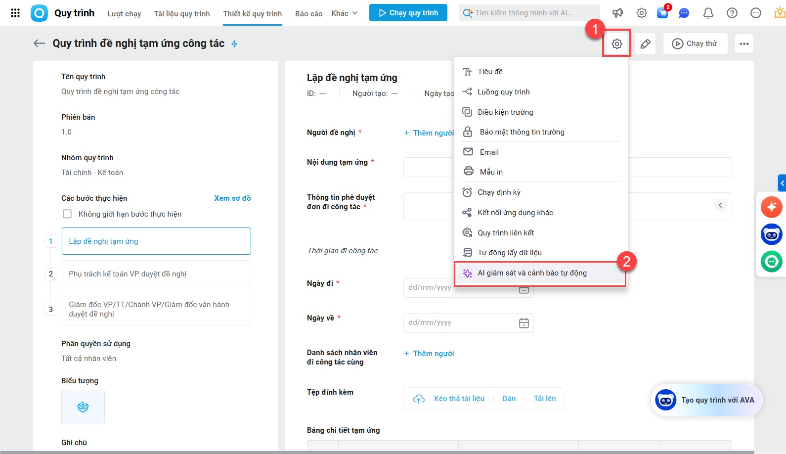 Sau khi phát hành, người dùng có thể sử dụng chức năng “AI giám sát và cảnh báo tự động” khi chạy quy trình. Hướng dẫn Tại đây.