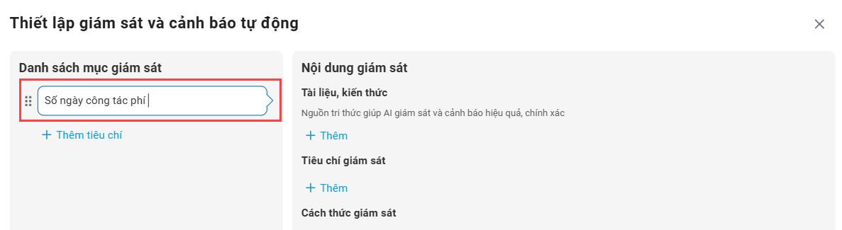 Sau khi chọn một mục giám sát, anh/chị cần định nghĩa các tiêu chí và quy tắc ở cột bên phải.