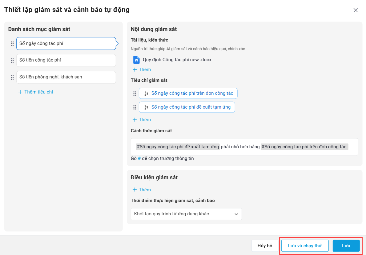 Bài viết này sẽ hướng dẫn anh/chị cách thiết lập các mục giám sát, định nghĩa tiêu chí và quy tắc để AI có thể tự động kiểm tra và cảnh báo trong một quy trình.