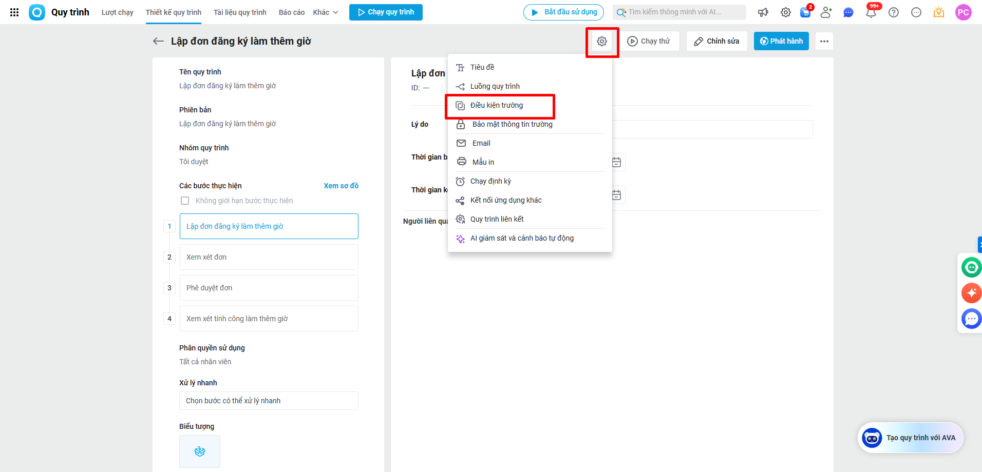 - Các bước thiết lập điều kiện trường trên AMIS Quy trình.