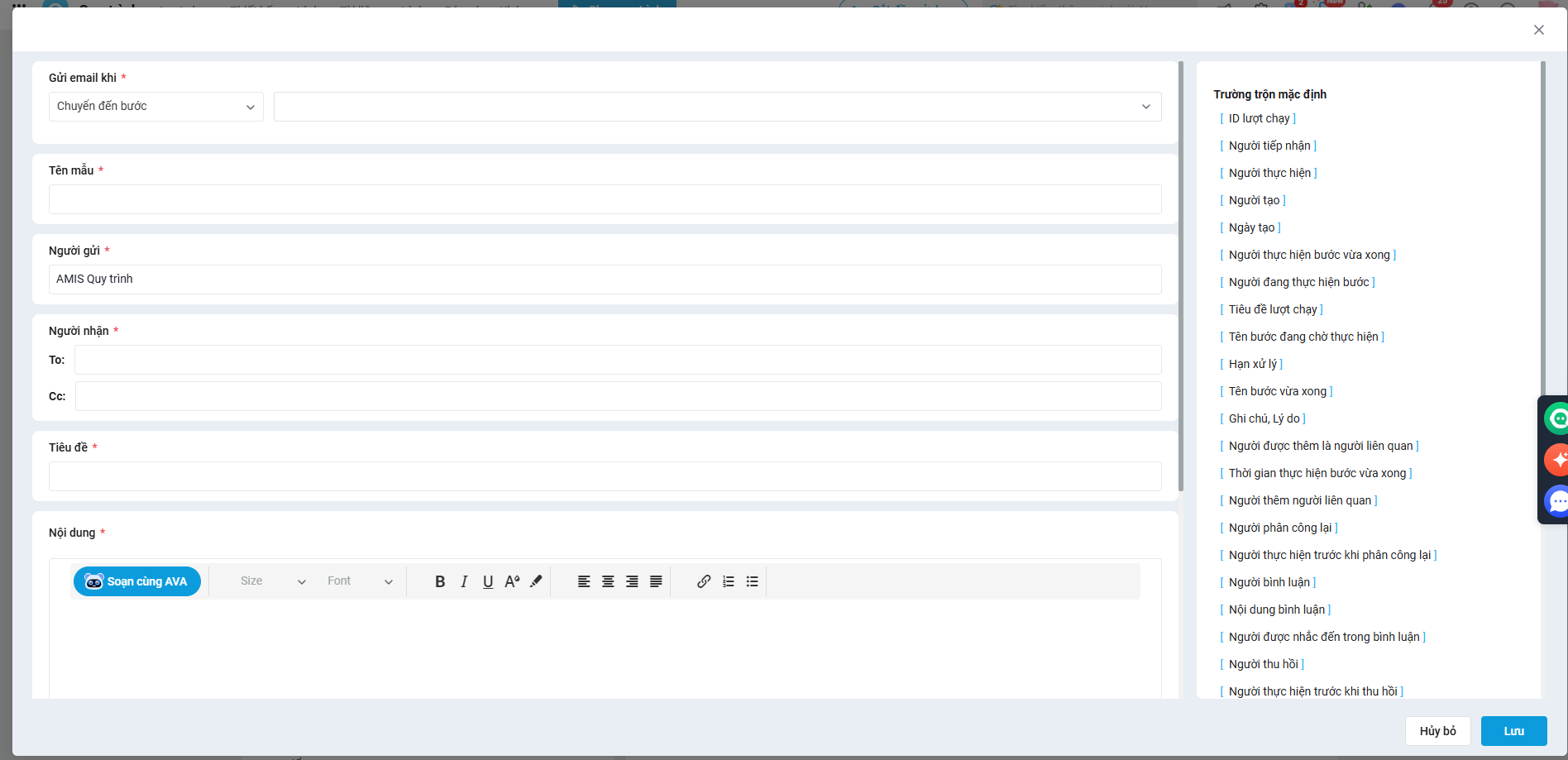 | Trả về bước | Tự động gửi email theo mẫu khi lượt chạy được trả về bước bất kỳ trong quy trình |