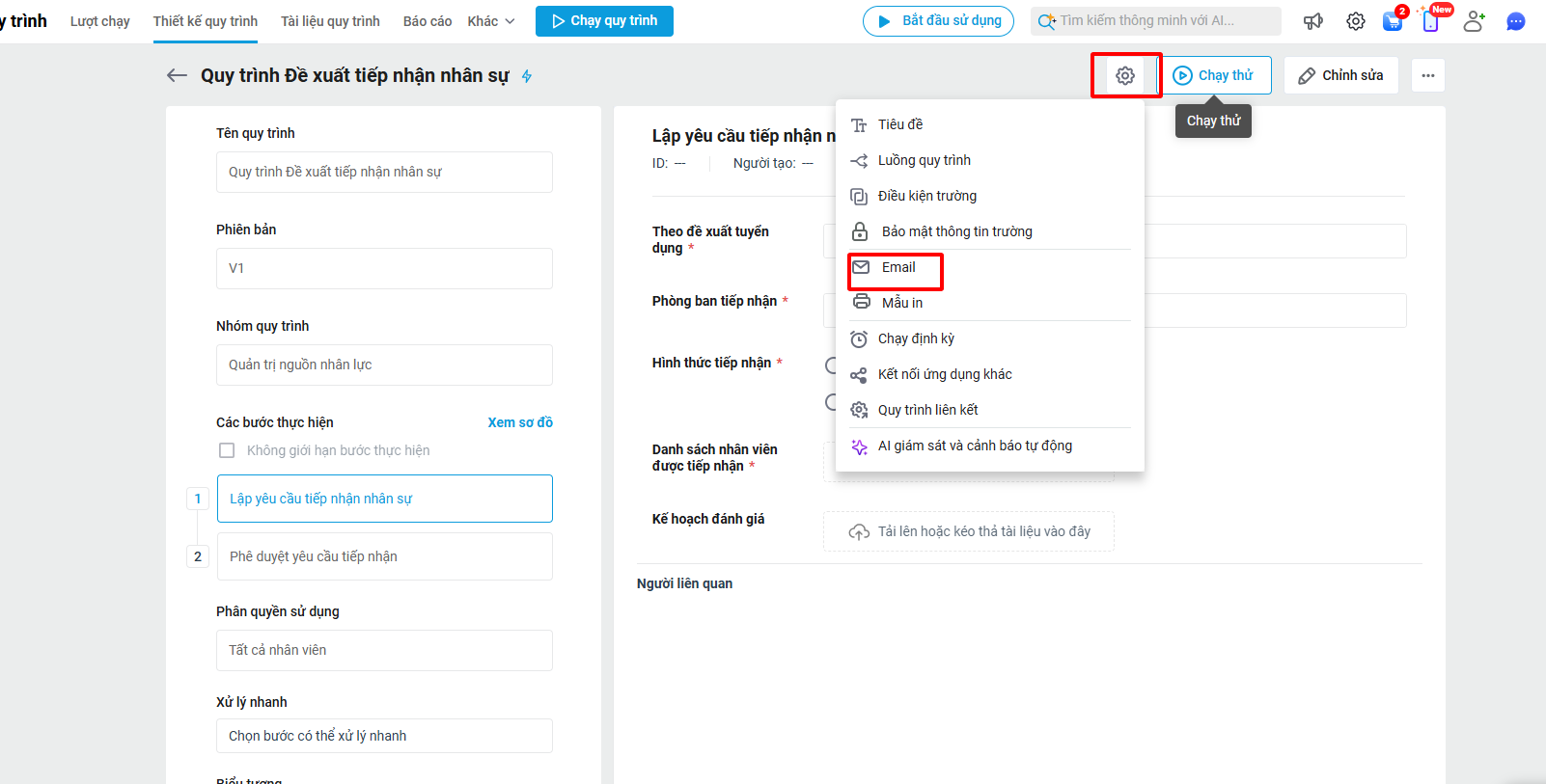 Bước 1: Tại giao diện Thiết kế quy trình\ chọn biểu tượng bánh răng