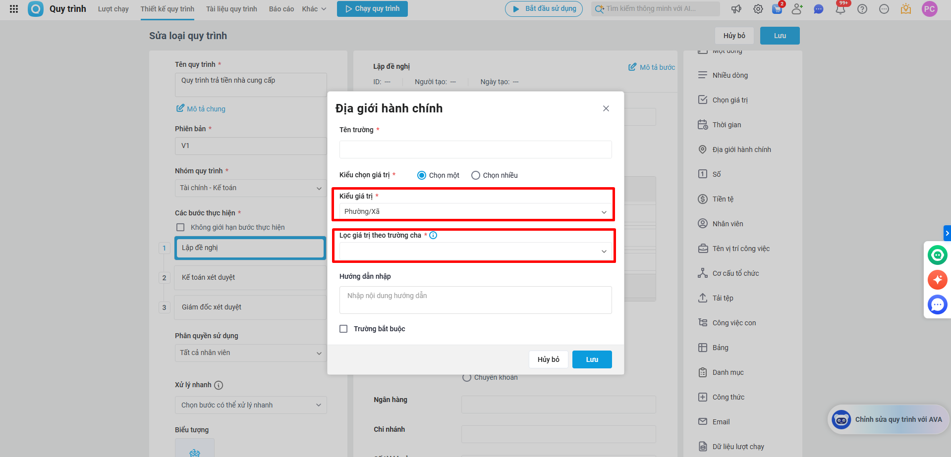 Trường Địa giới hành chính – Hướng dẫn cấu hình và sử dụng trường Địa chỉ trong quy trình