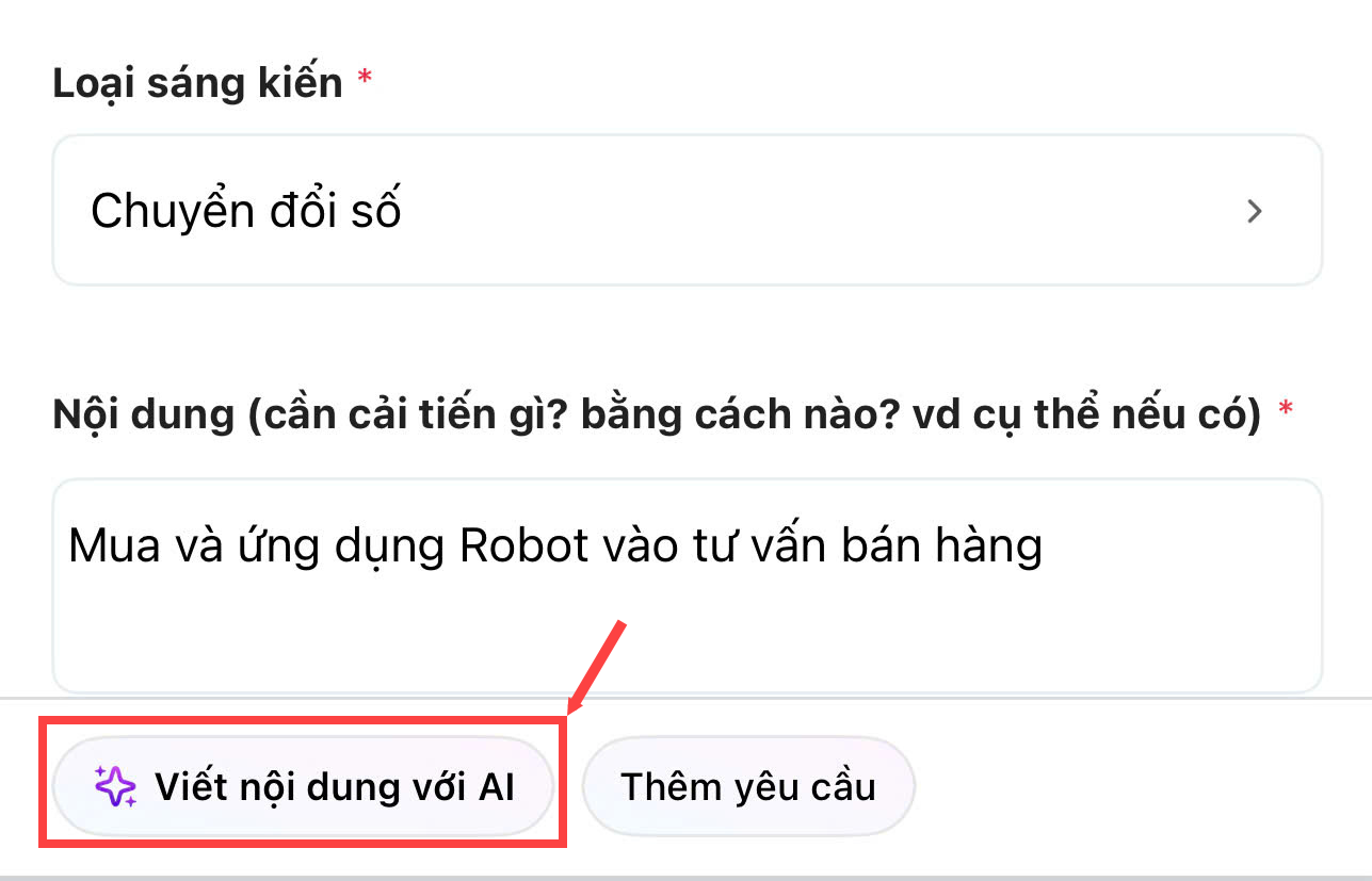 1. Tại các trường thông tin cần nhập liệu, anh/chị nhấn vào biểu tượng cây bút Viết nội dung với AI.