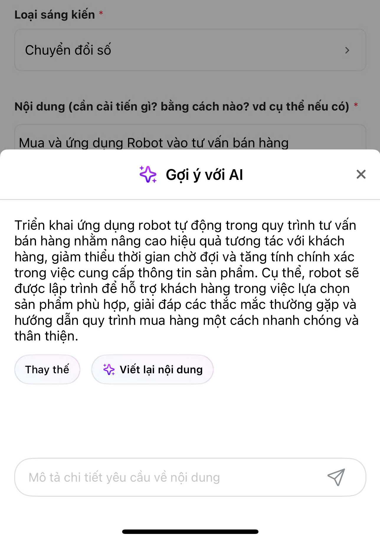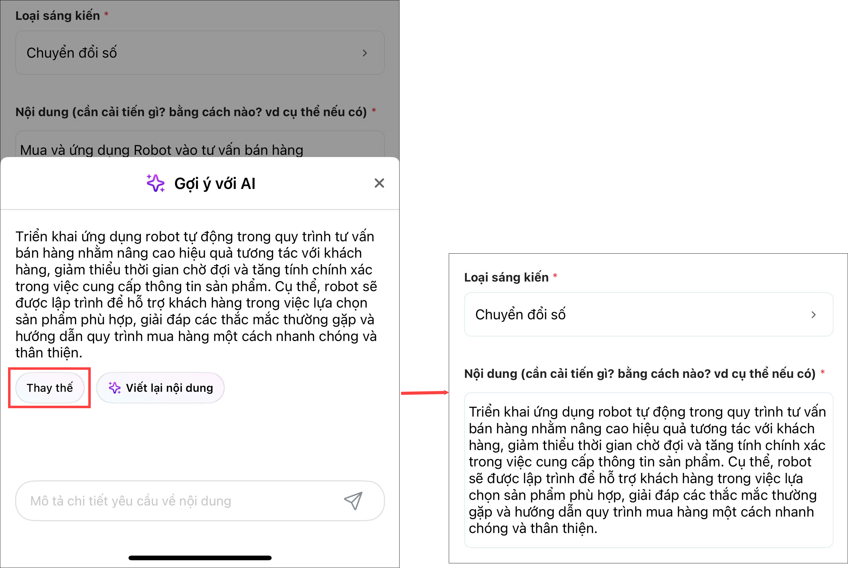 - Thay thế: Nếu đã hài lòng, nhấn Thay thế để sử dụng nội dung do AI gợi ý. Hệ thống sẽ tự động cập nhật nội dung mới này vào trường thông tin và đóng pop-up.