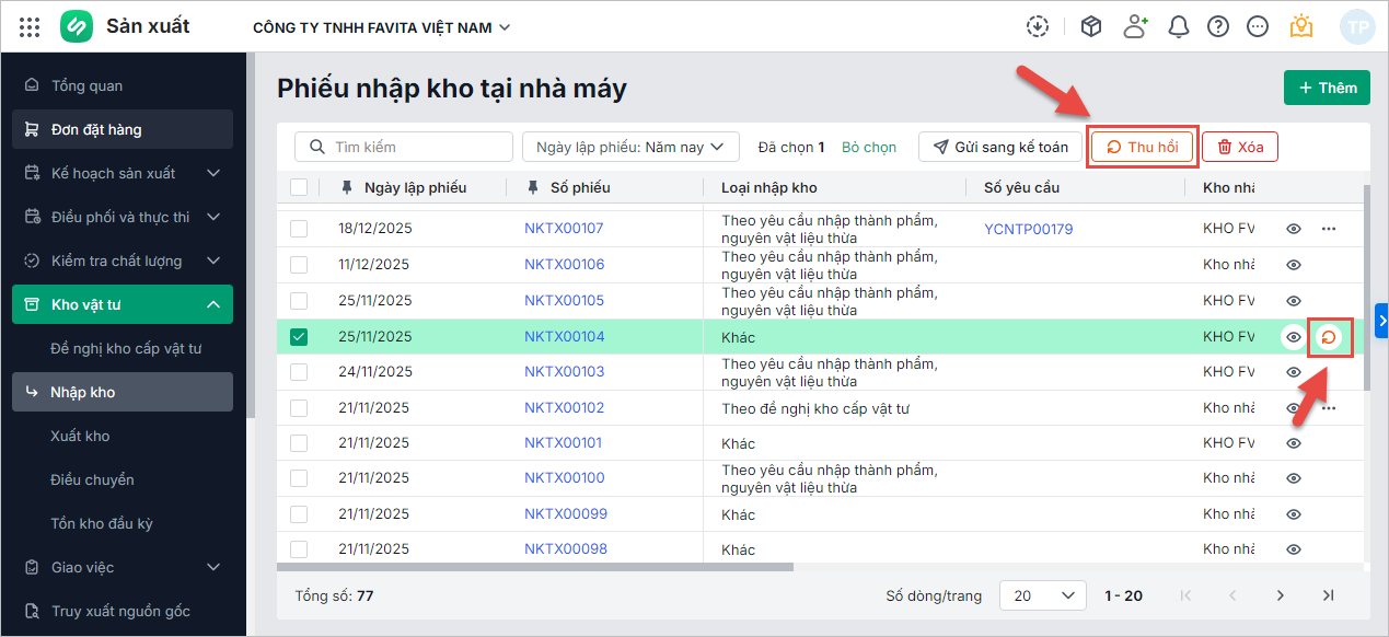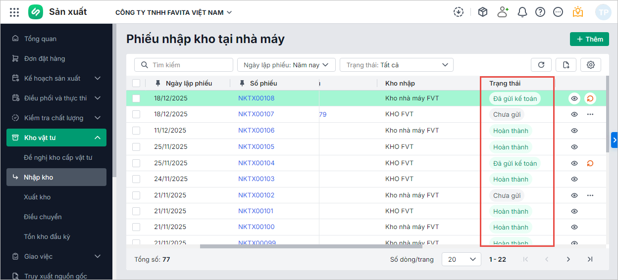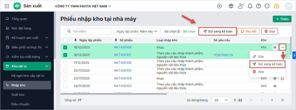 - Nhân viên sản xuất thực hiện gửi phiếu nhập kho tại nhà máy có trạng thái Chưa gửi sang AMIS Kế toán bằng cách chọn chức năng Gửi sang kế toán.