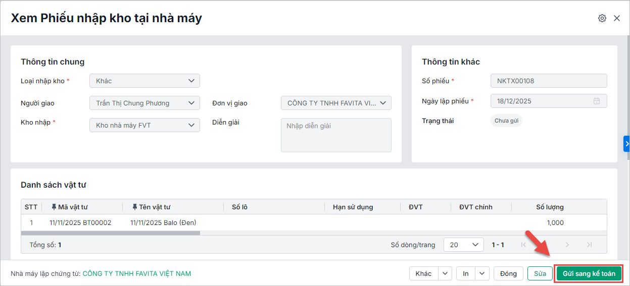 Luồng 2: Gửi kế toán phiếu nhập kho khác tại nhà máy