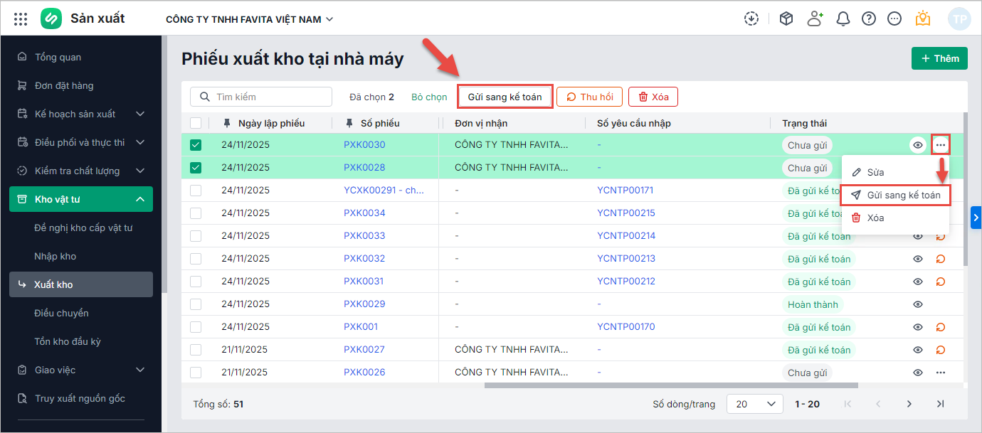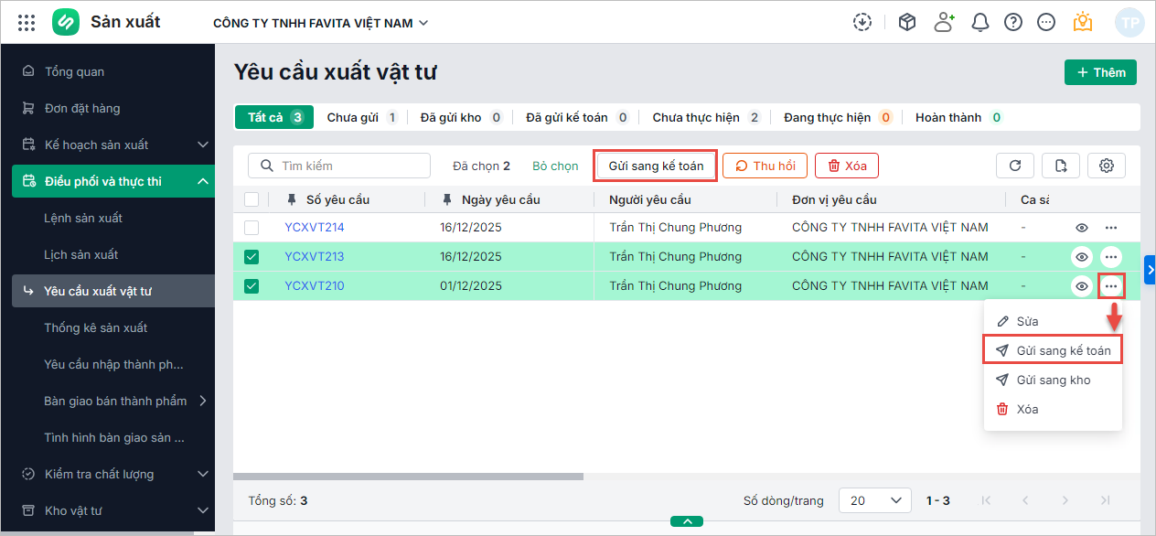- Nhân viên sản xuất thực hiện gửi yêu cầu xuất vật tư sang AMIS Kế toán bằng cách chọn chức năng Gửi sang kế toán.