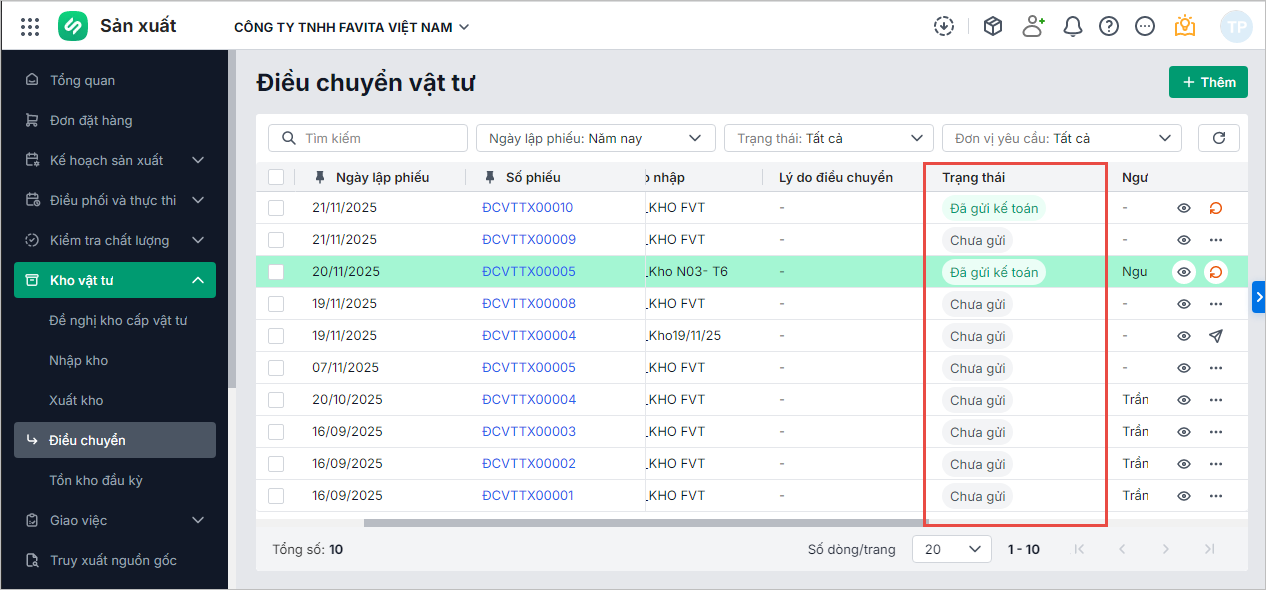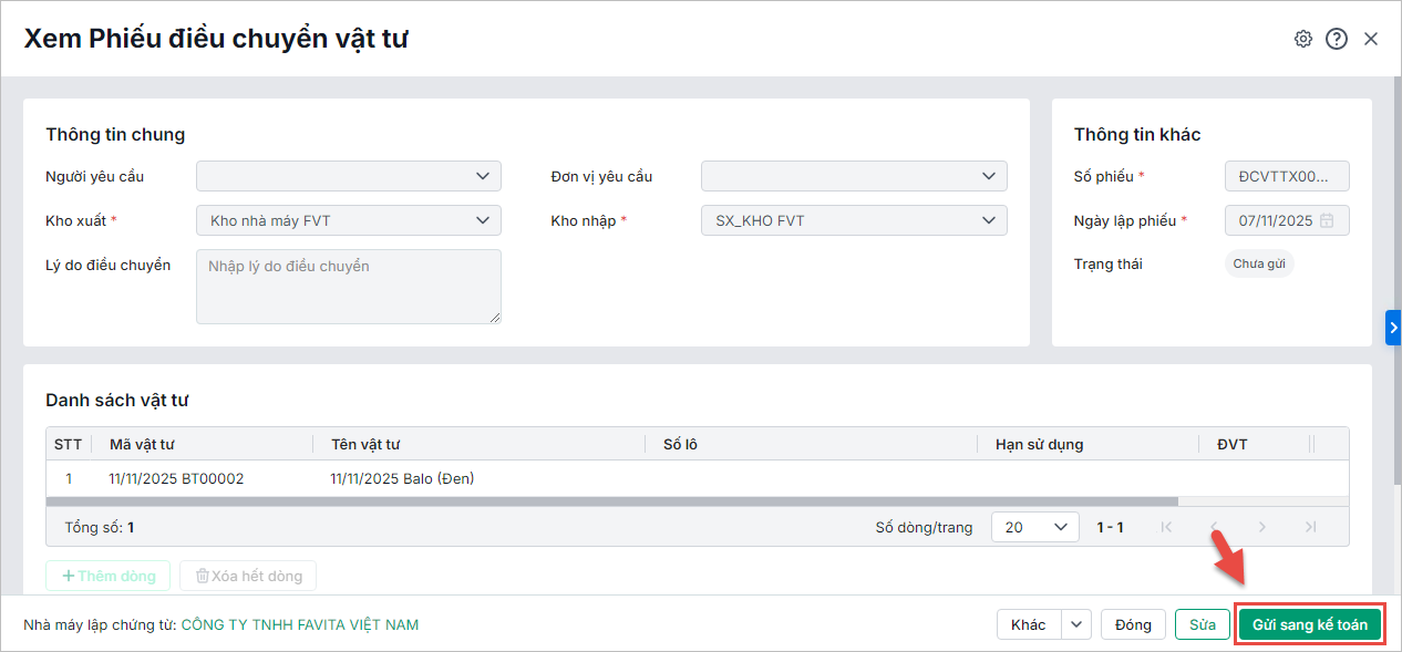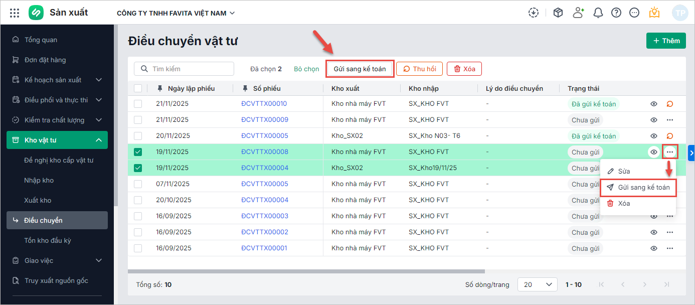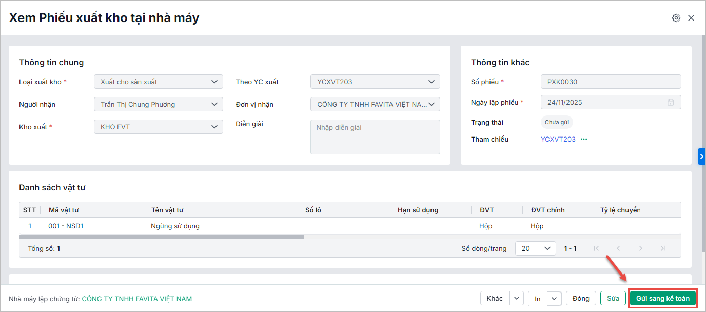 - Nhân viên sản xuất thực hiện gửi điều chuyển vật tư tại nhà máy sang AMIS Kế toán bằng cách chọn chức năng Gửi sang kế toán.