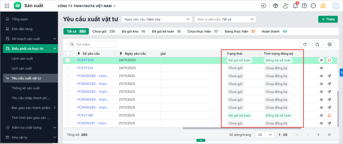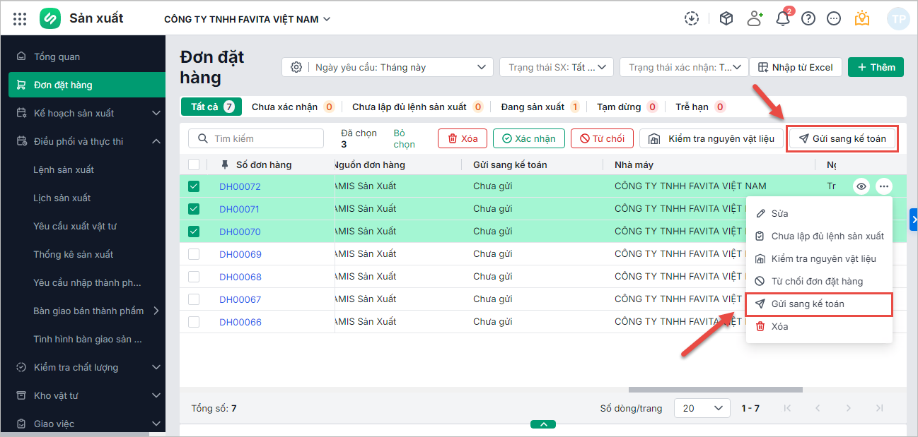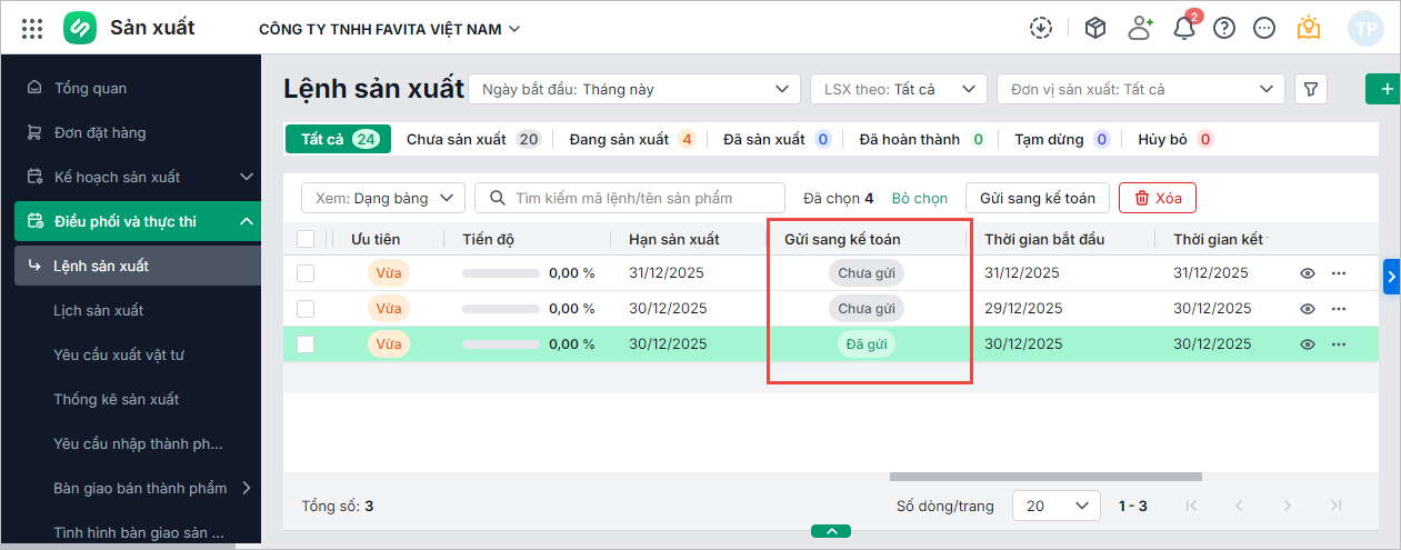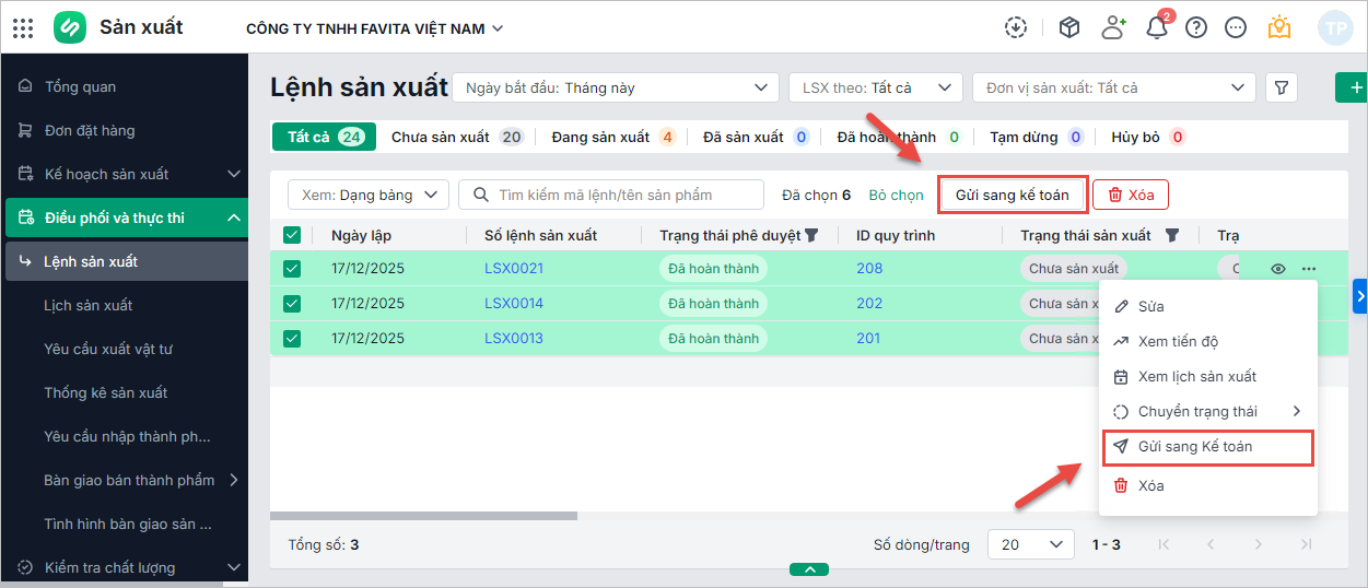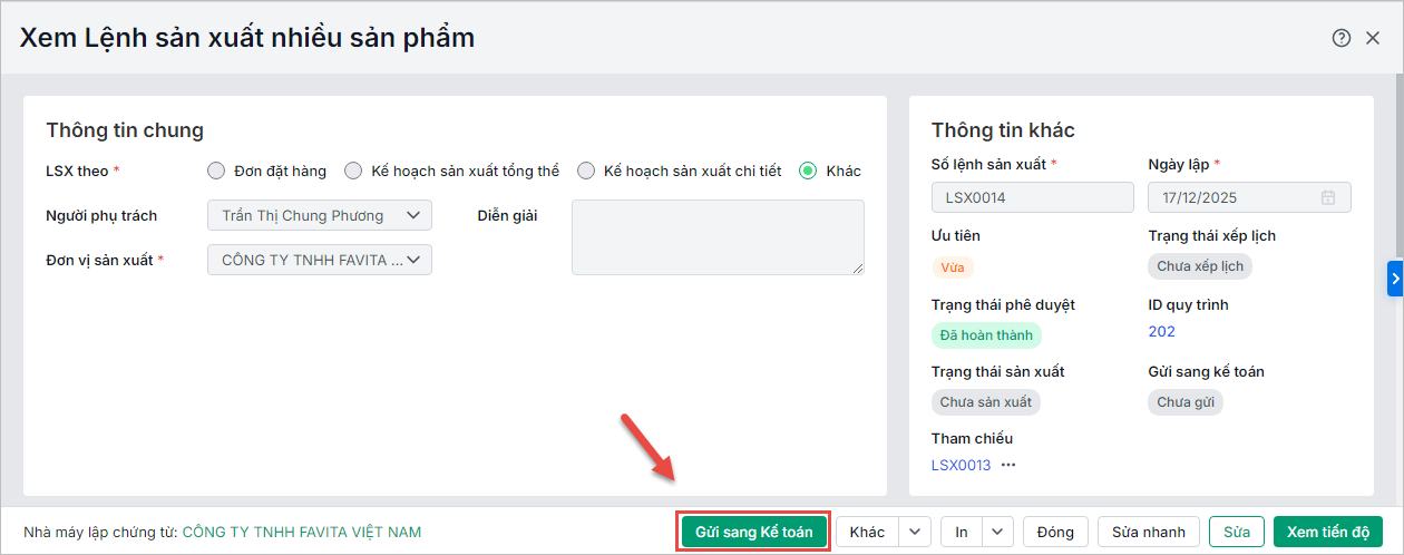 Lưu ý: Nếu trên AMIS Workflow phát hành đồng thời luồng Gửi phê duyệt lệnh sản xuất và luồng Gửi lệnh sản xuất sang Kế toán thì chức năng Gửi sang kế toán chỉ hiển thị với lệnh sản xuất có Tình trạng phê duyệt là Đã hoàn thành.