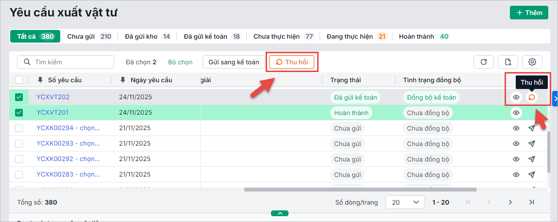 - Trường hợp yêu cầu đã gửi sang kế toán do nhầm lẫn hoặc có vấn đề phát sinh, anh/chị có thể Thu hồi