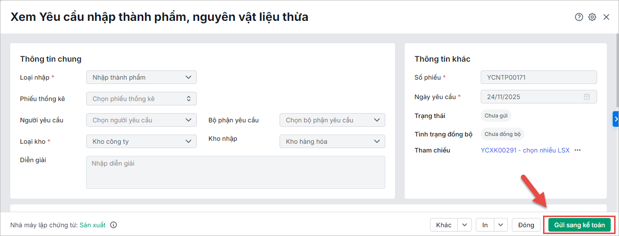 - Nhân viên sản xuất thực hiện gửi yêu cầu nhập thành phẩm, NVL thừa sang AMIS Kế toán bằng cách chọn chức năng Gửi sang kế toán.
