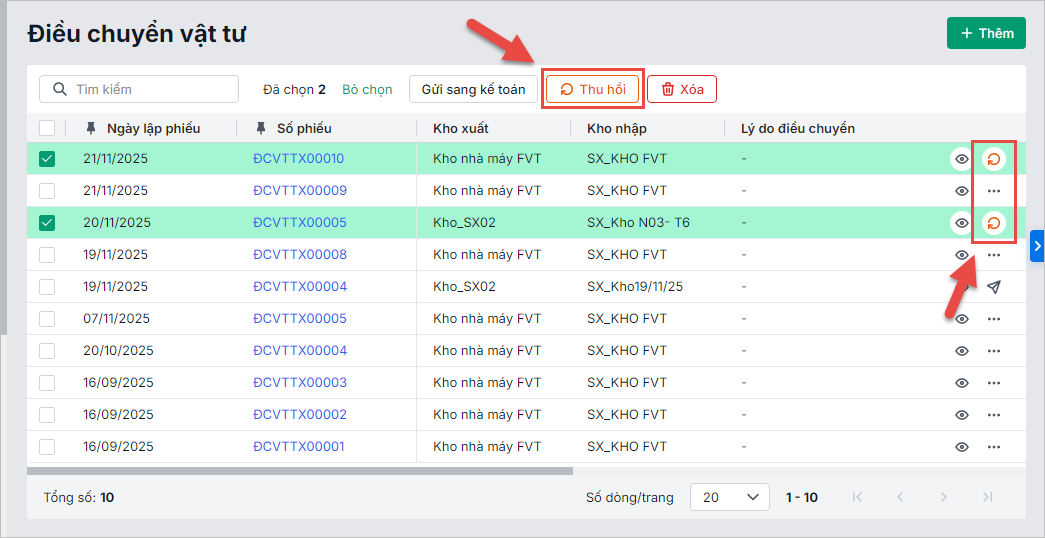 - Trường hợp chứng từ đã gửi sang kế toán do nhầm lẫn hoặc có vấn đề phát sinh, anh/chị có thể Thu hồi