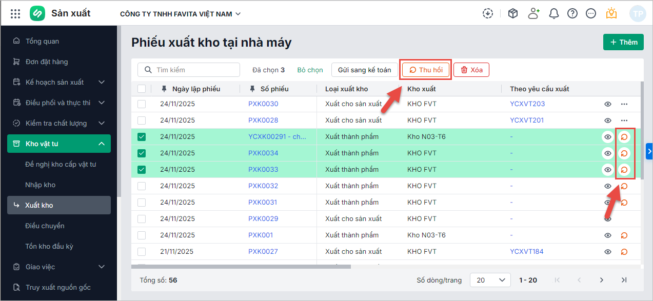 - Nhân viên sản xuất thực hiện gửi phiếu xuất kho tại nhà máy có trạng thái Chưa gửi sang AMIS Kế toán.