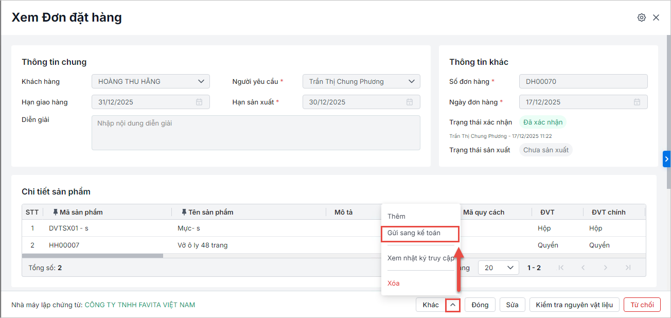 Lưu ý: Chức năng Gửi sang kế toán chỉ hiển thị khi đơn đặt hàng thỏa mãn điều kiện