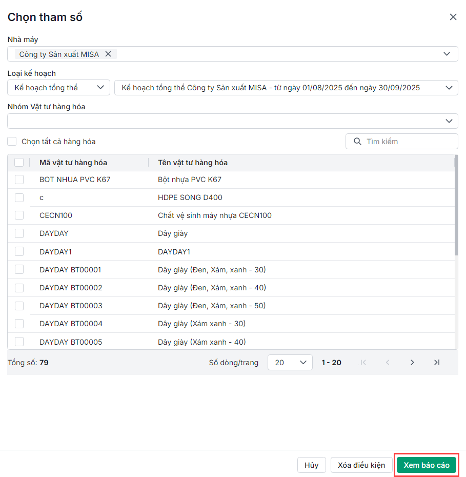 2. Chọn tham số xem báo cáo. Nhấn Xem báo cáo