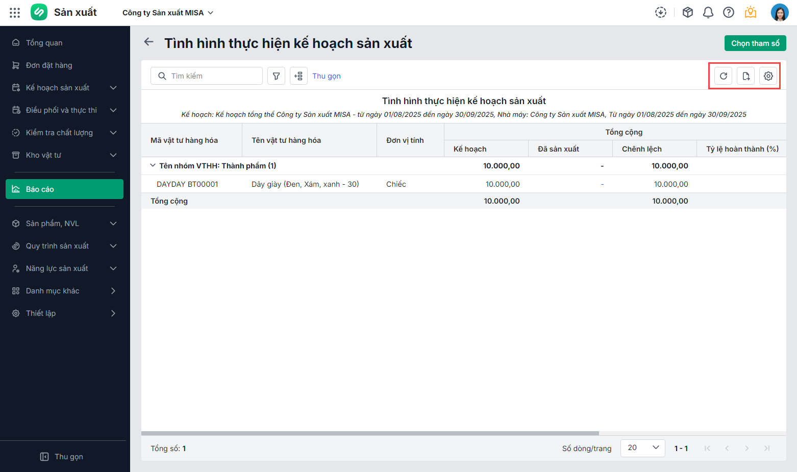 1. Tại phân hệ Báo cáo, chọn báo cáo cần xem (Ví dụ chọn xem báo cáo Tình hình thực hiện kế hoạch sản xuất)