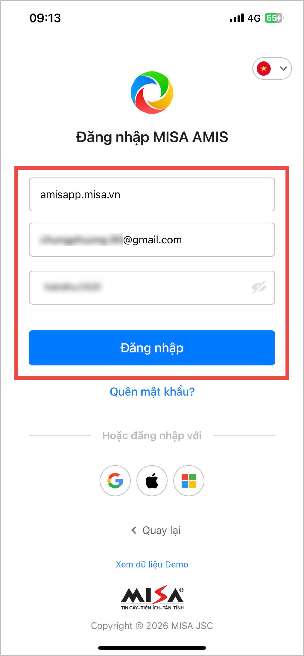 - Số điện thoại/Email và mật khẩu đăng nhập (sử dụng MISA ID để đăng nhập).