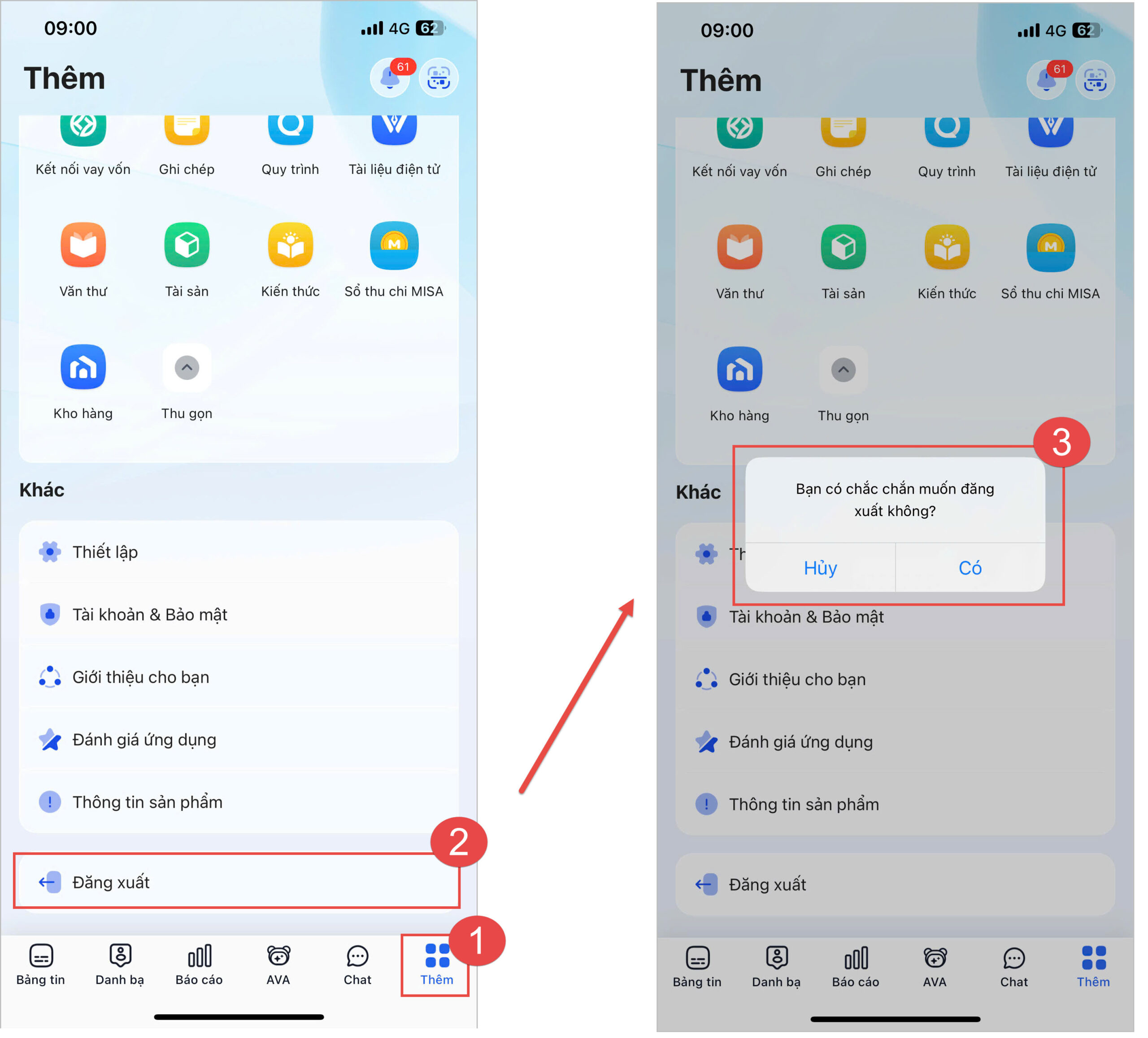 Bước 3: Chương trình hiển thị thông báo để xác nhận việc đăng xuất khỏi ứng dụng MISA AMIS mobile: