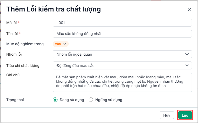 - Nhóm lỗi: Chọn nhóm lỗi nếu doanh nghiệp có phân nhóm (như lỗi ngoại quan, lỗi kỹ thuật,…).
