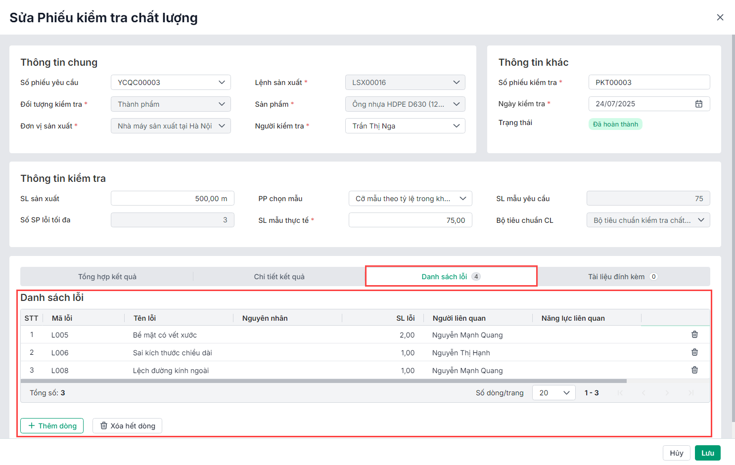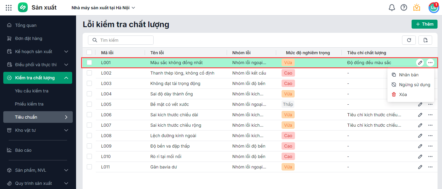 Sau khi thêm lỗi kiểm tra chất lượng sẽ được thêm vào danh sách. Tại đây, anh/chị có thể: