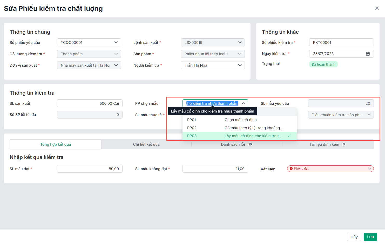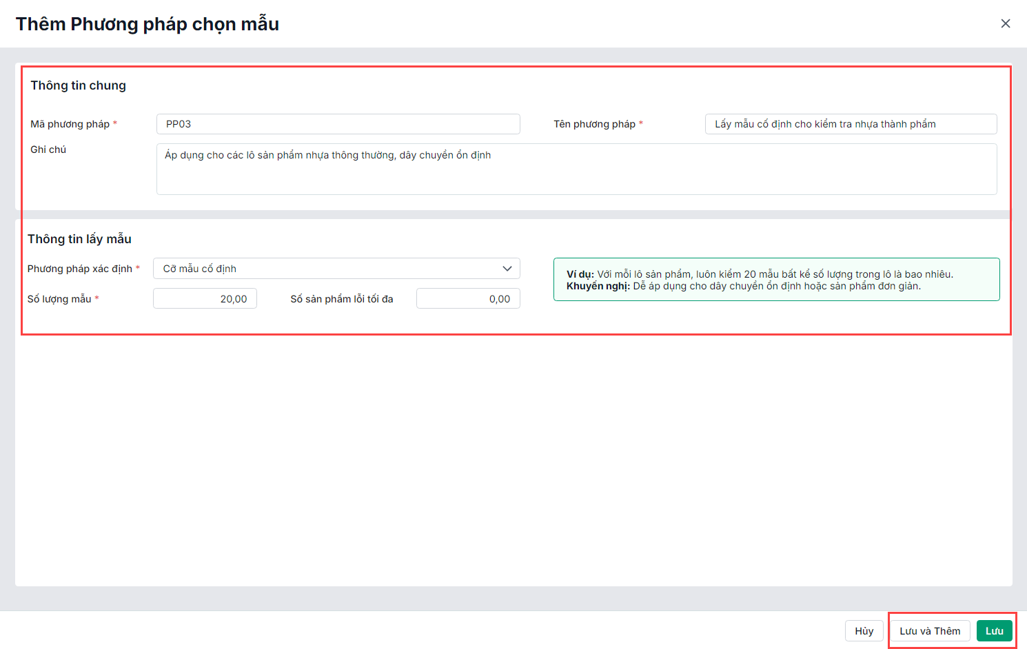 - Số sản phẩm lỗi tối đa: Nhập số sản phẩm lỗi tối đa cho phép trong các mẫu đã lấy.