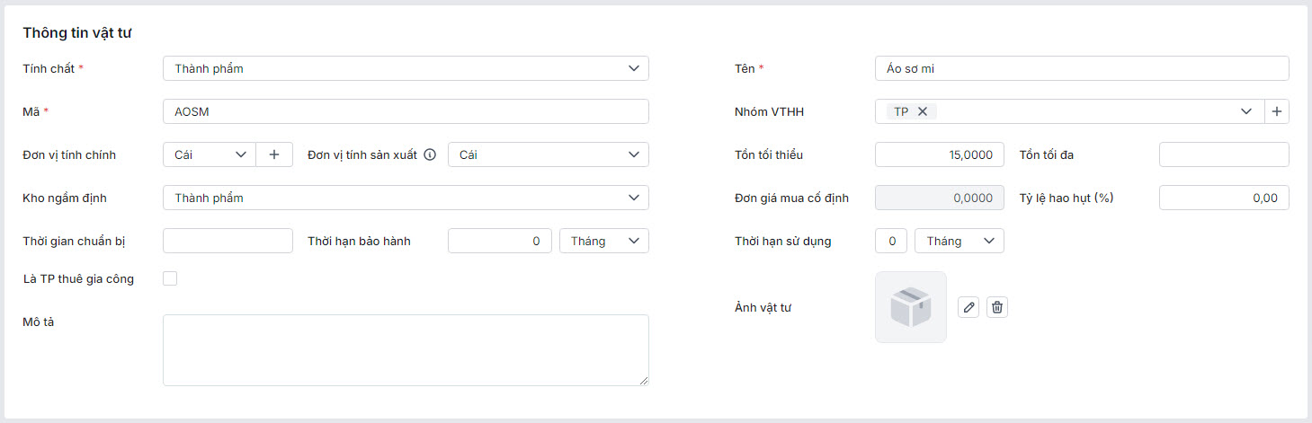 Lưu ý: Để quản lý vật tư theo Thuộc tính (biến thể), cần thiết lập hình thức quản lý VTHH theo Biến thể. Hướng dẫn tại đây.