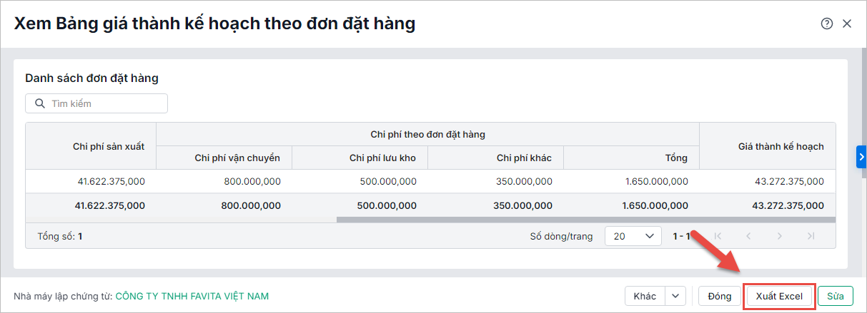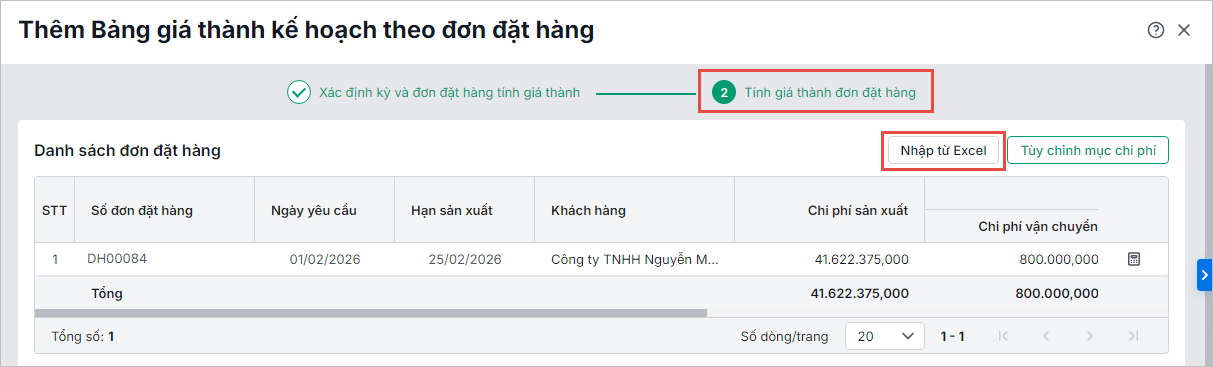 - Nhấn Nhập từ Excel để nhập khẩu nhanh Bảng tính giá thành đơn đặt hàng tương tự theo hướng dẫn tại đây.