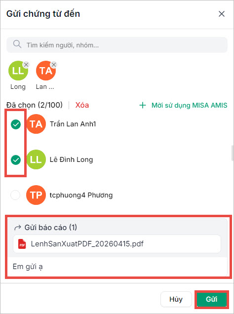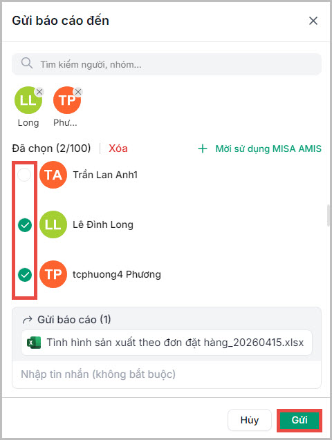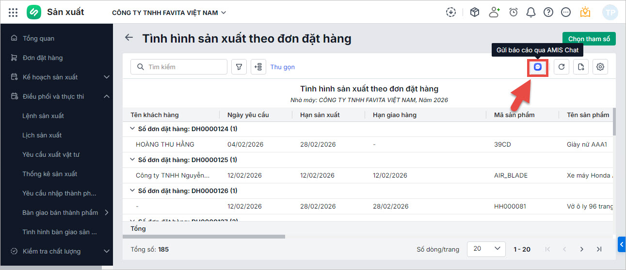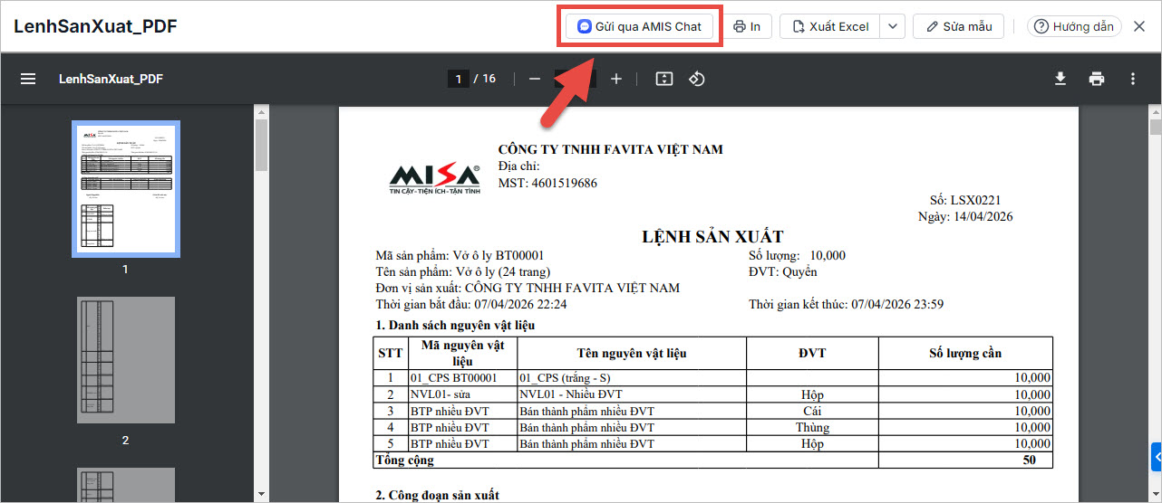 Chương trình cho phép gửi các chứng từ sản xuất, báo cáo sản xuất thông qua AMIS Chat…ngay trên phần mềm mà không mất công xuất khẩu ra excel hay in ra bản cứng.